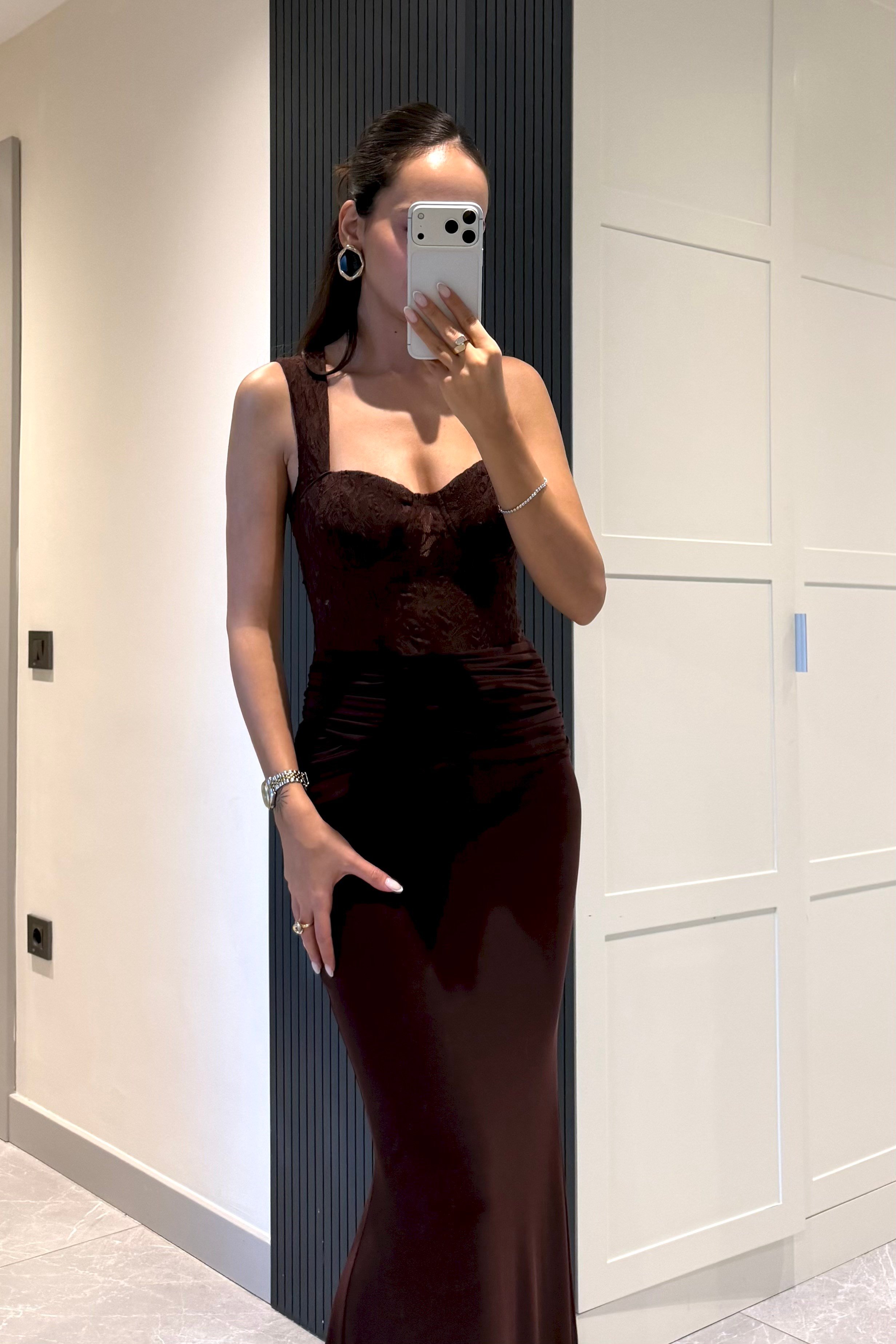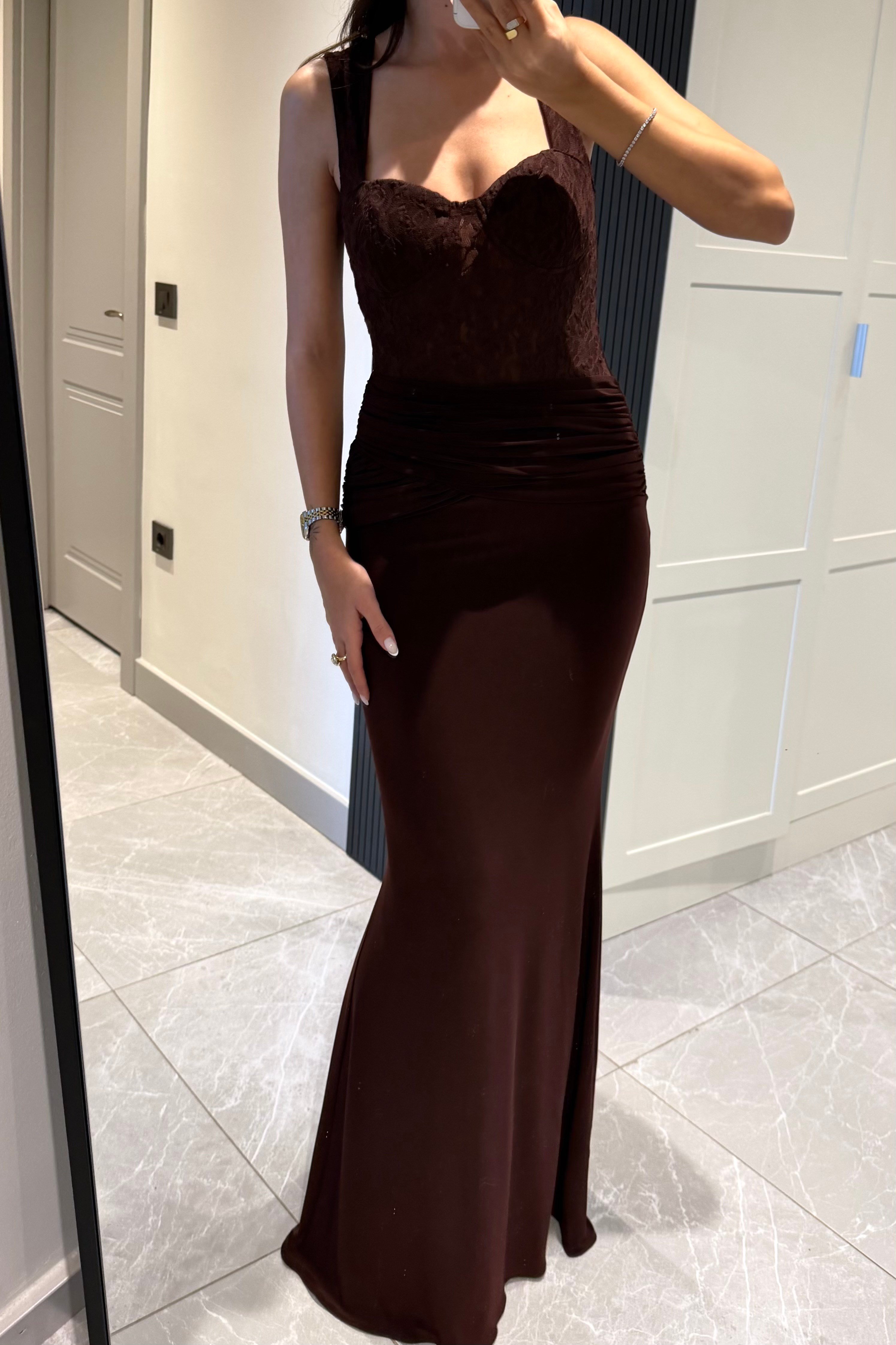 Acı Kahve Beli Dantelli Uzun Elbise. %90 Polyamid %10 Elastan. Sırttan fermuar kapamalıdır. Görsel S bedendir. Model Ölçüleri: Boy:1,72 cm Kilo:52 kg Bel:60 cm Basen:90 cm.