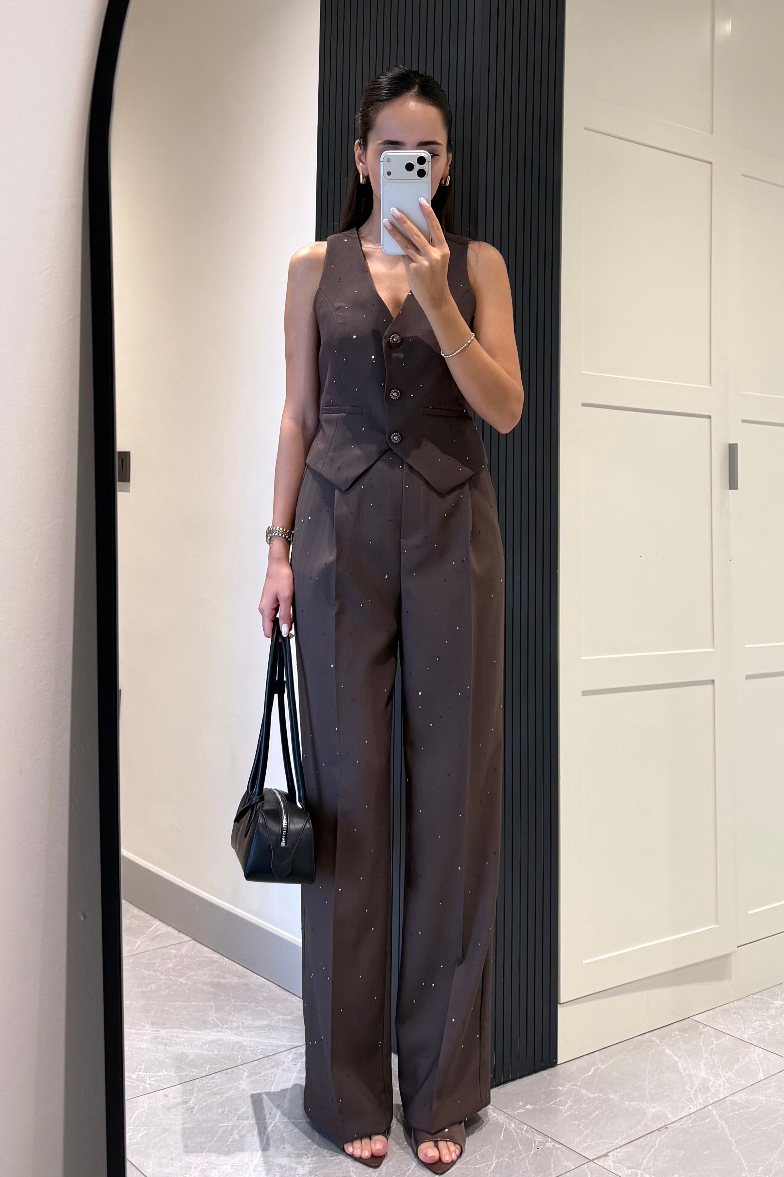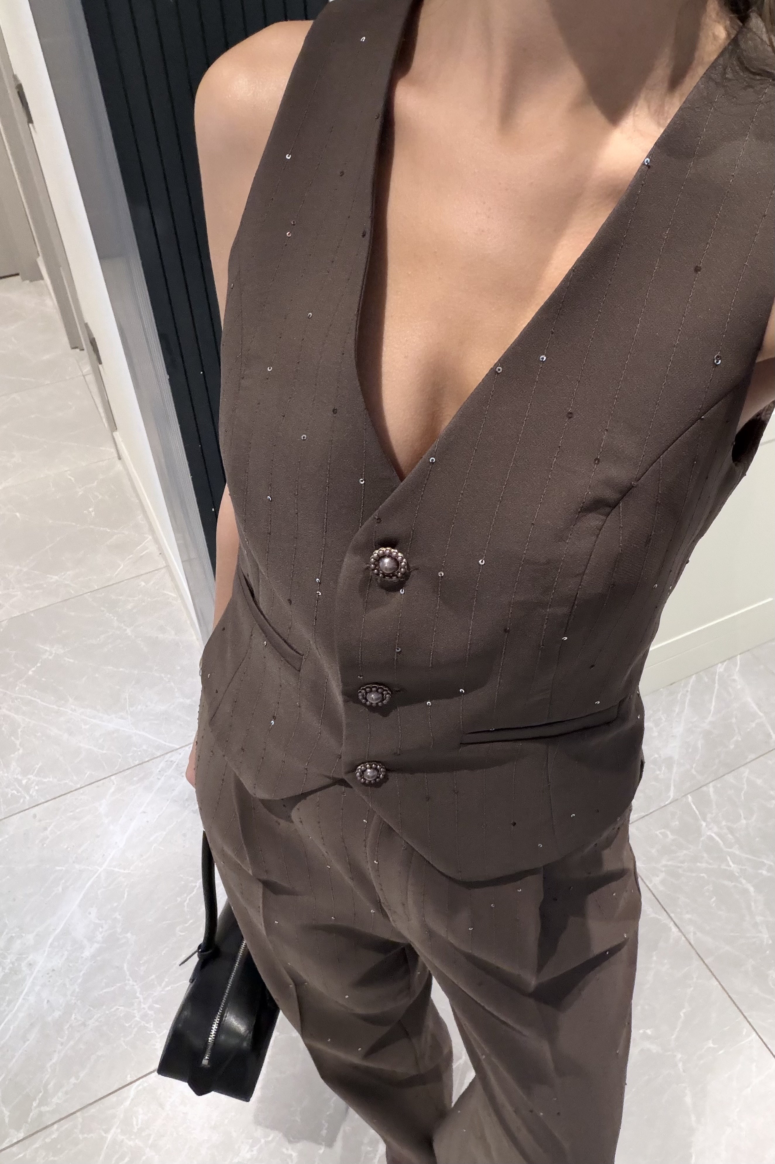 Acı Kahve Pullu Pantolon Yelek Takım Ekru Pullu Pantolon Yelek Takım