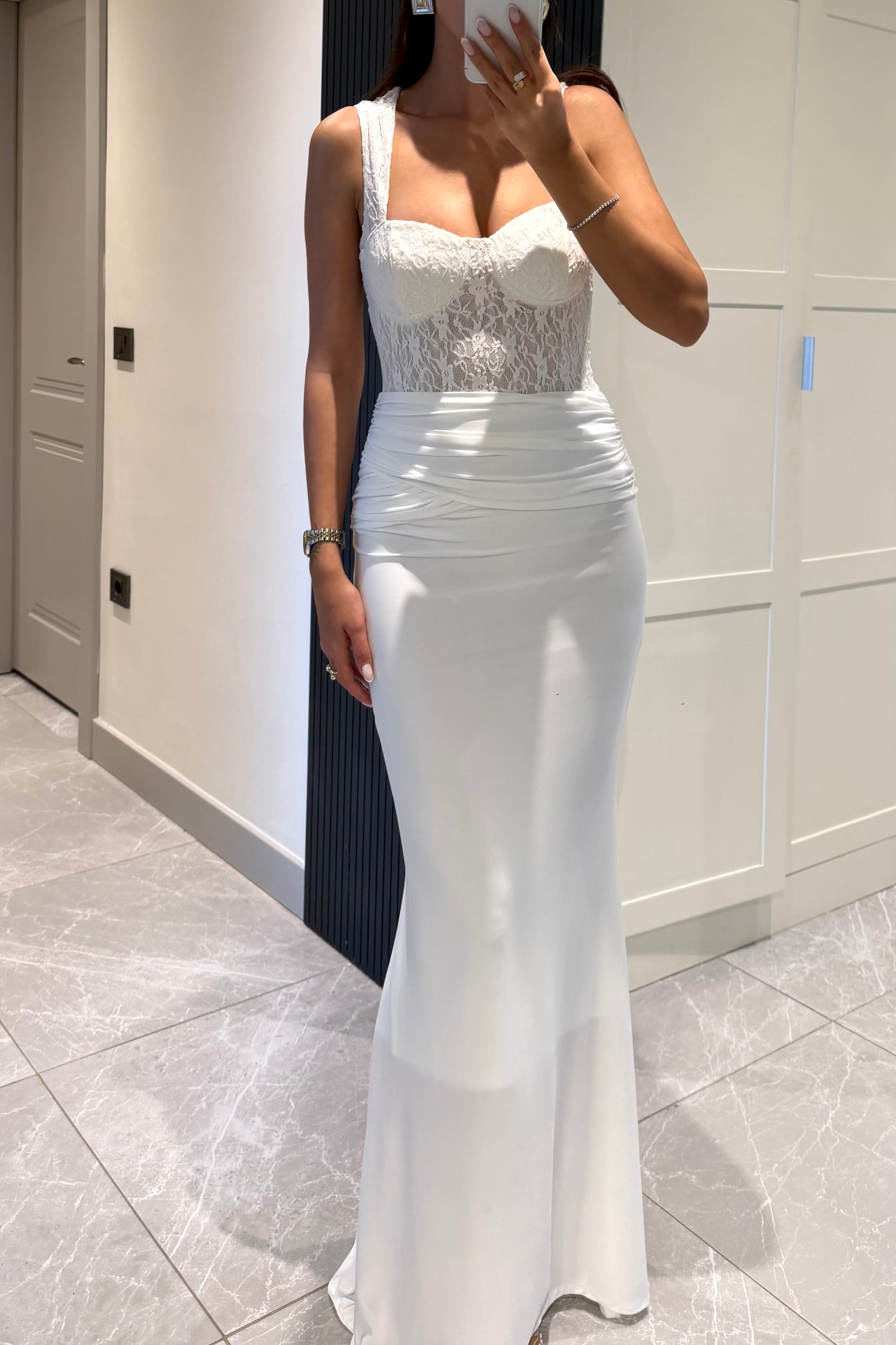 Beyaz Beli Dantelli Uzun Elbise. %90 Polyamid %10 Elastan. Sırttan fermuar kapamalıdır. Görsel S bedendir. Model Ölçüleri: Boy:1,72 cm Kilo:52 kg Bel:60 cm Basen:90 cm.