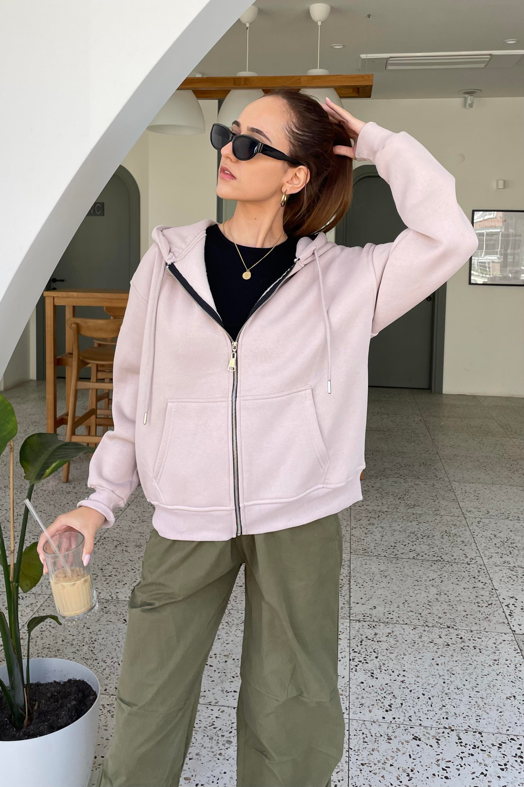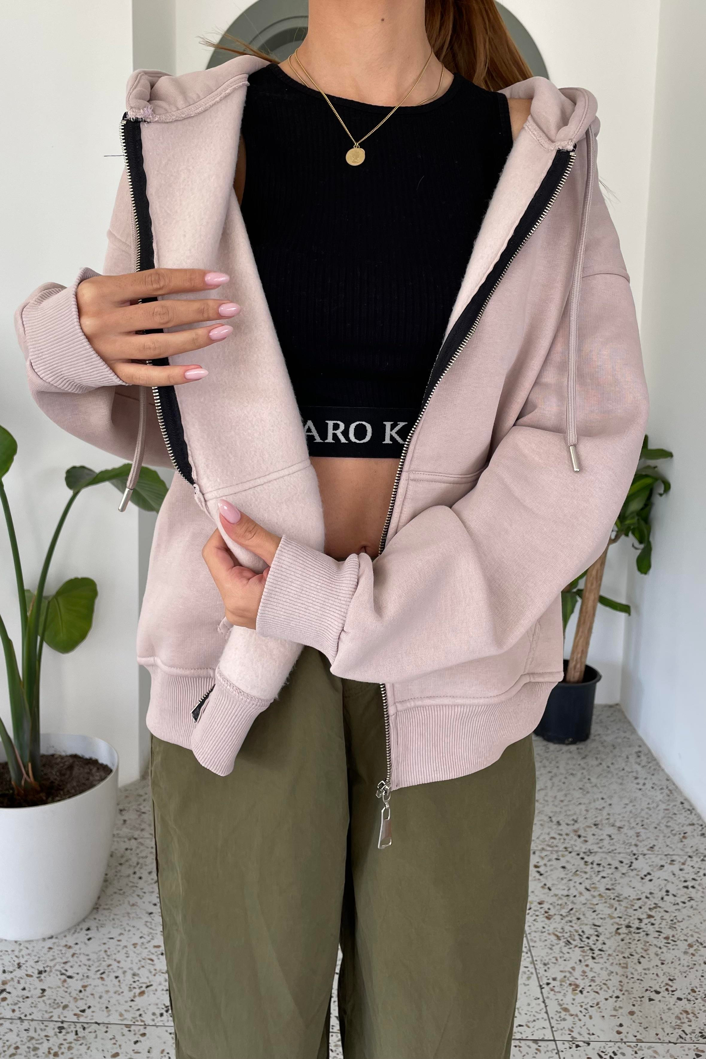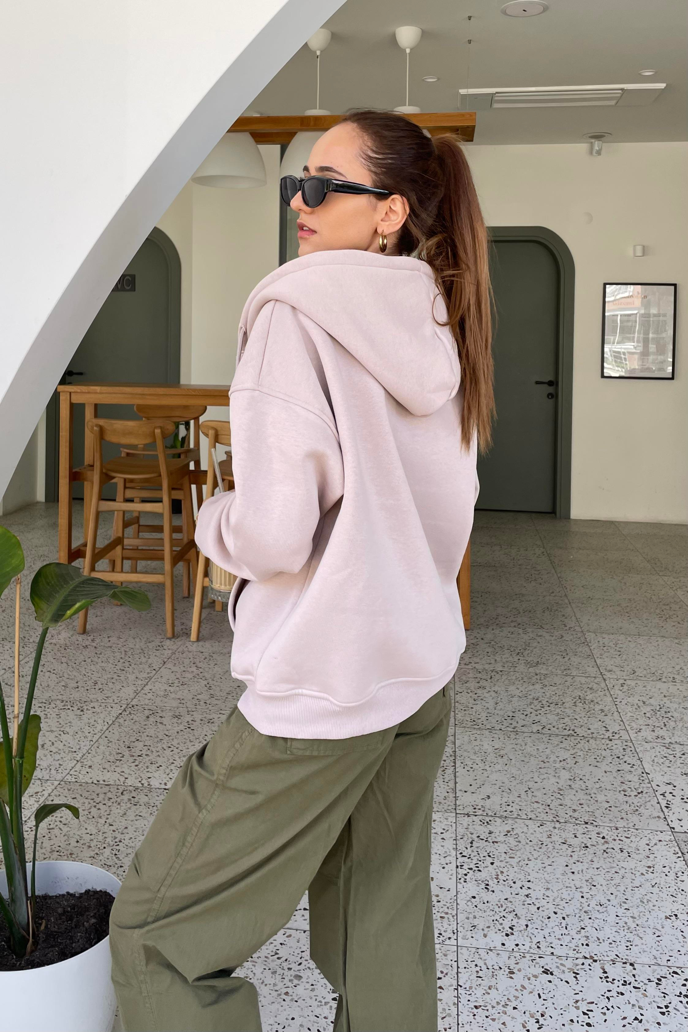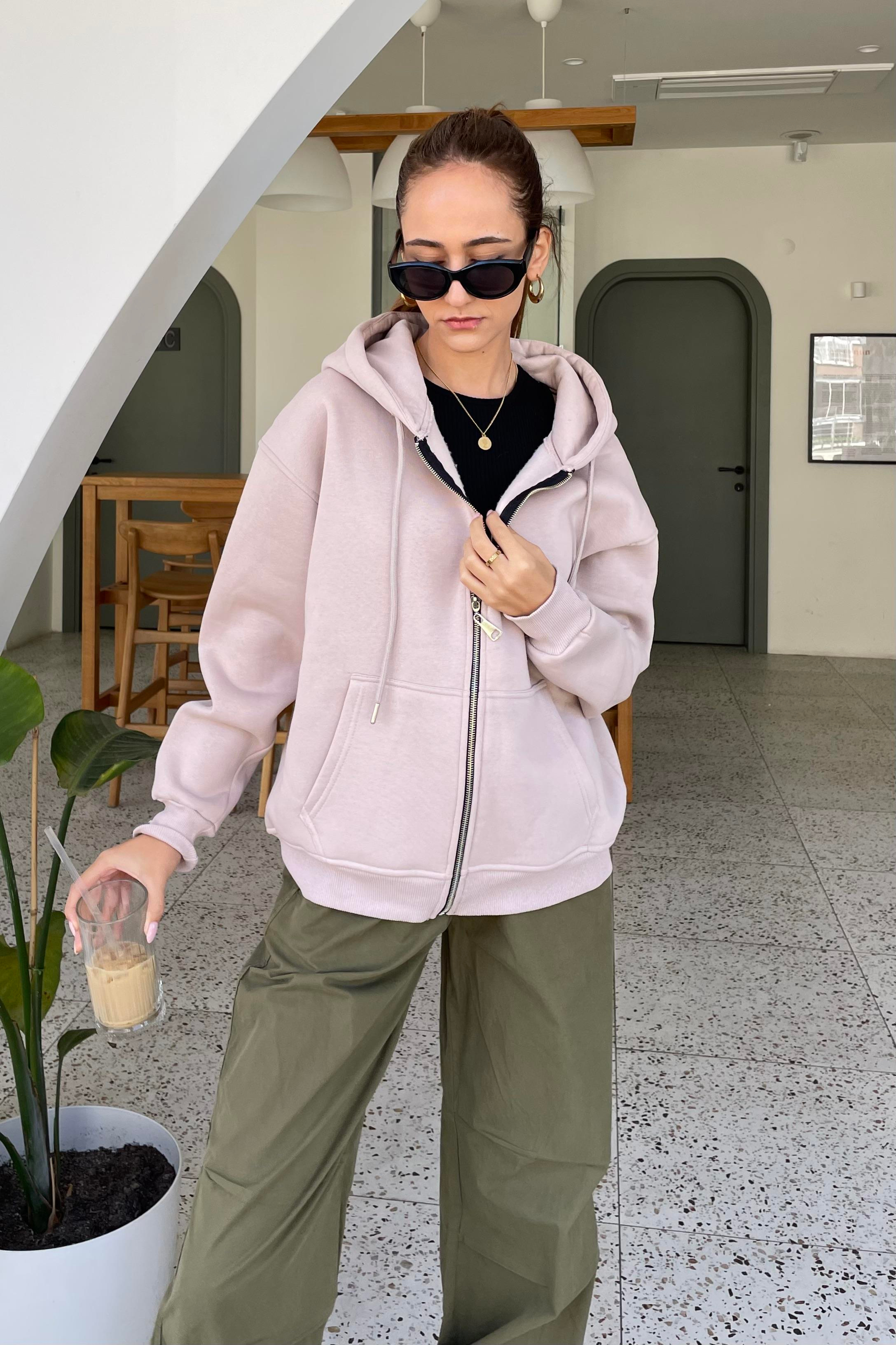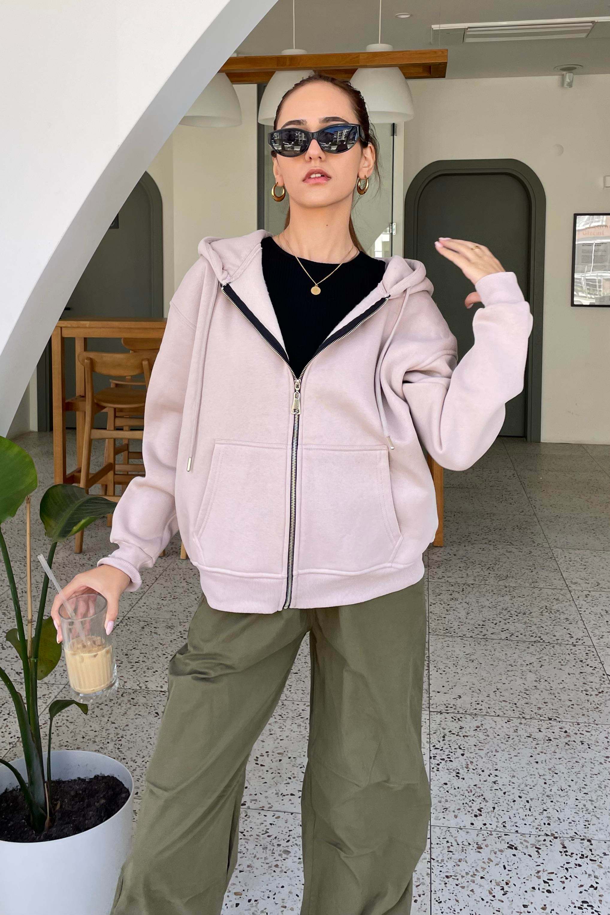 Beige Zipped Raised Cloth Sweatshirt Beige Blue Loose and Braided Sweater