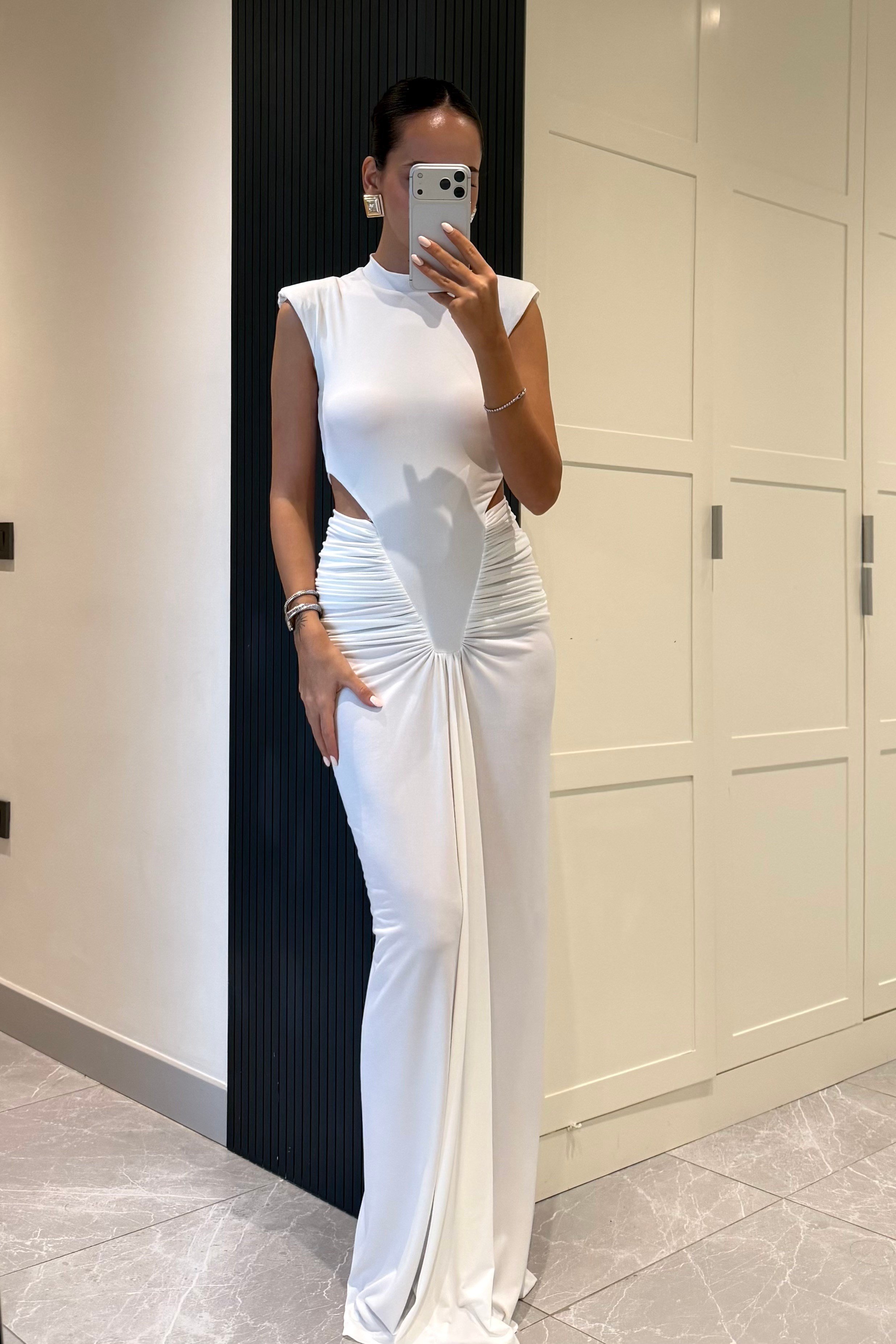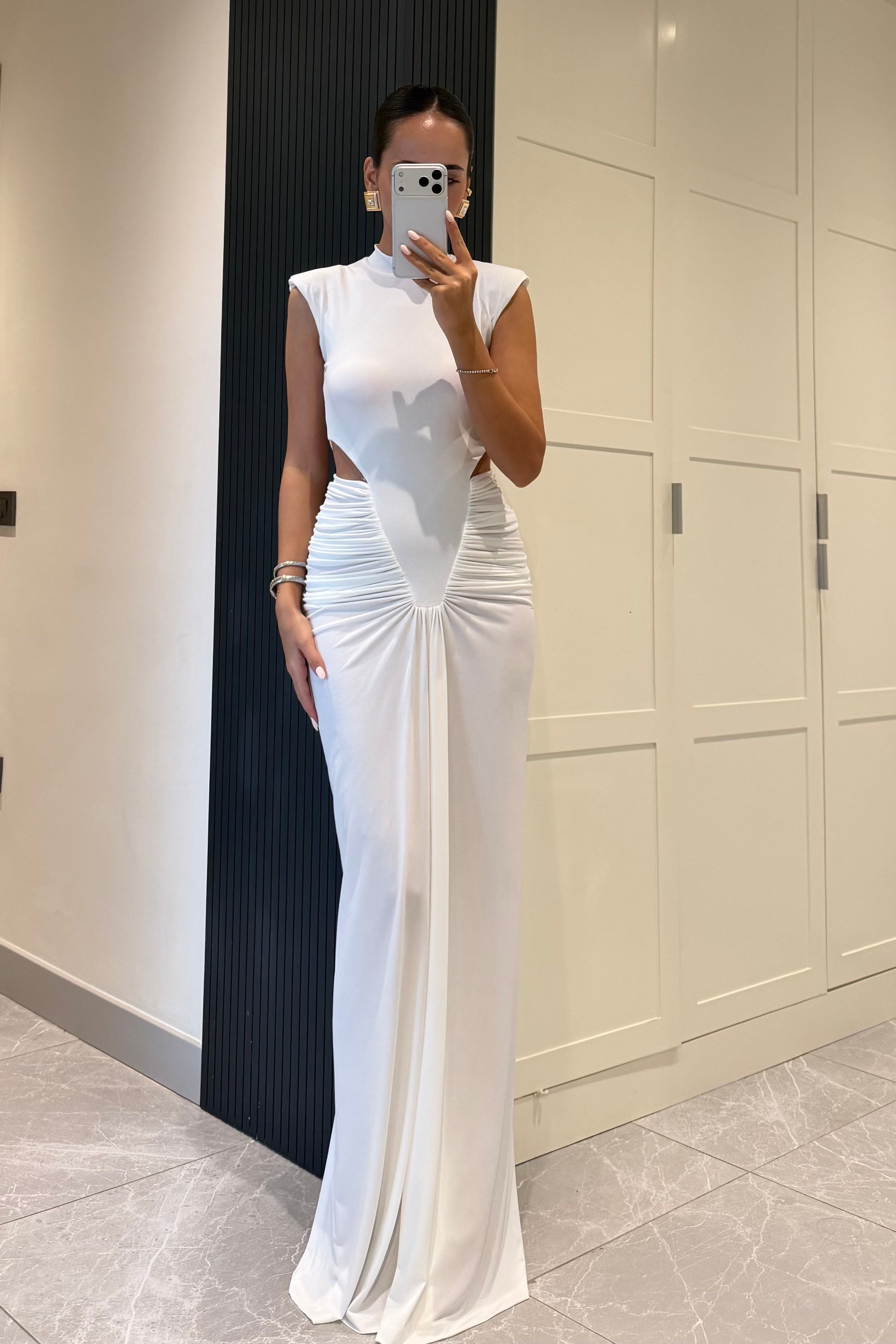 Beyaz Kolsuz Bel Dekolteli Drape Uzun Elbise. %90 Polyamid %10 Elastan. Görsel S bedendir. Model Ölçüleri: Boy:1,72 cm Kilo:52 kg Bel:60 cm Basen:90 cm.
