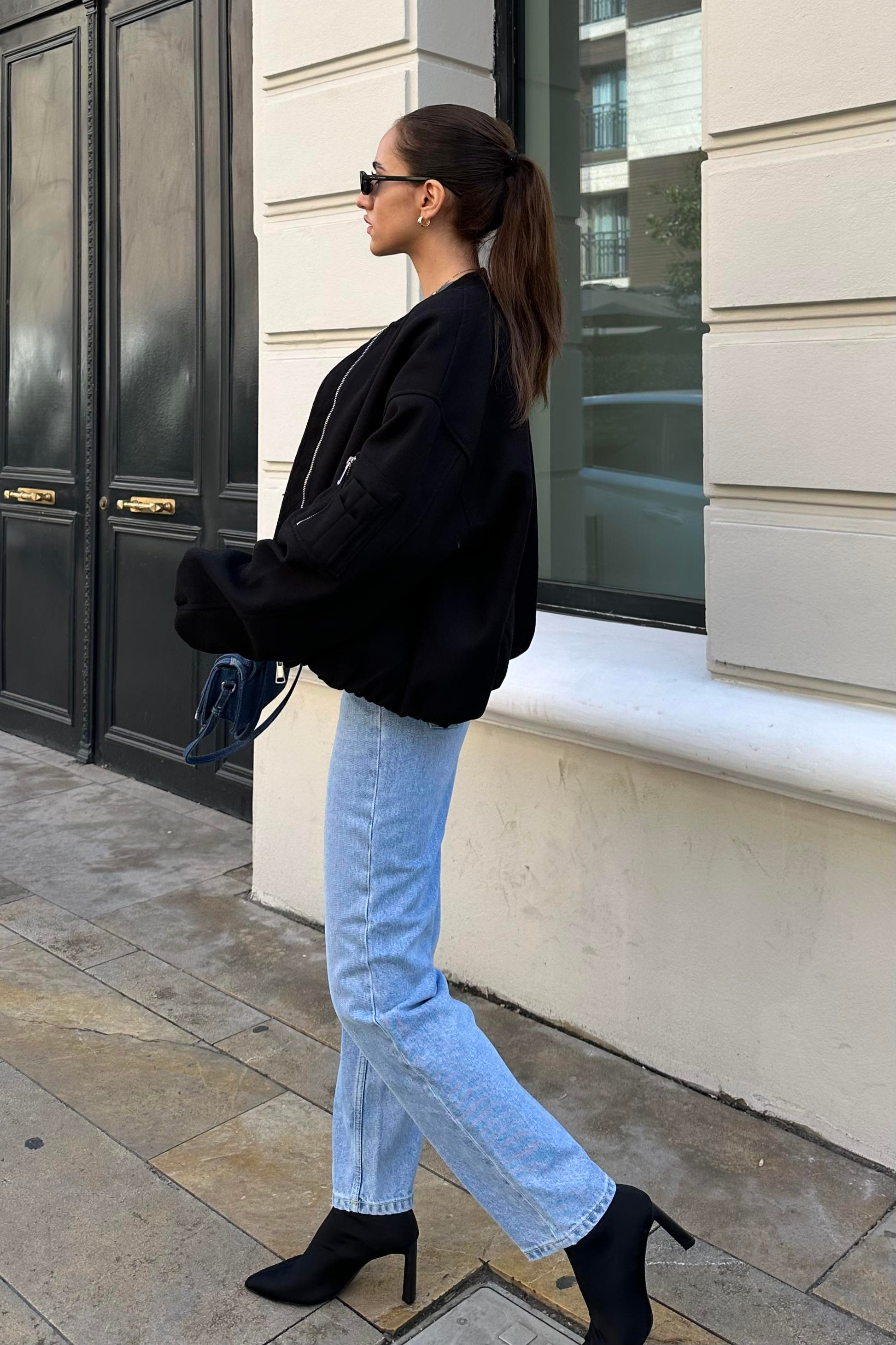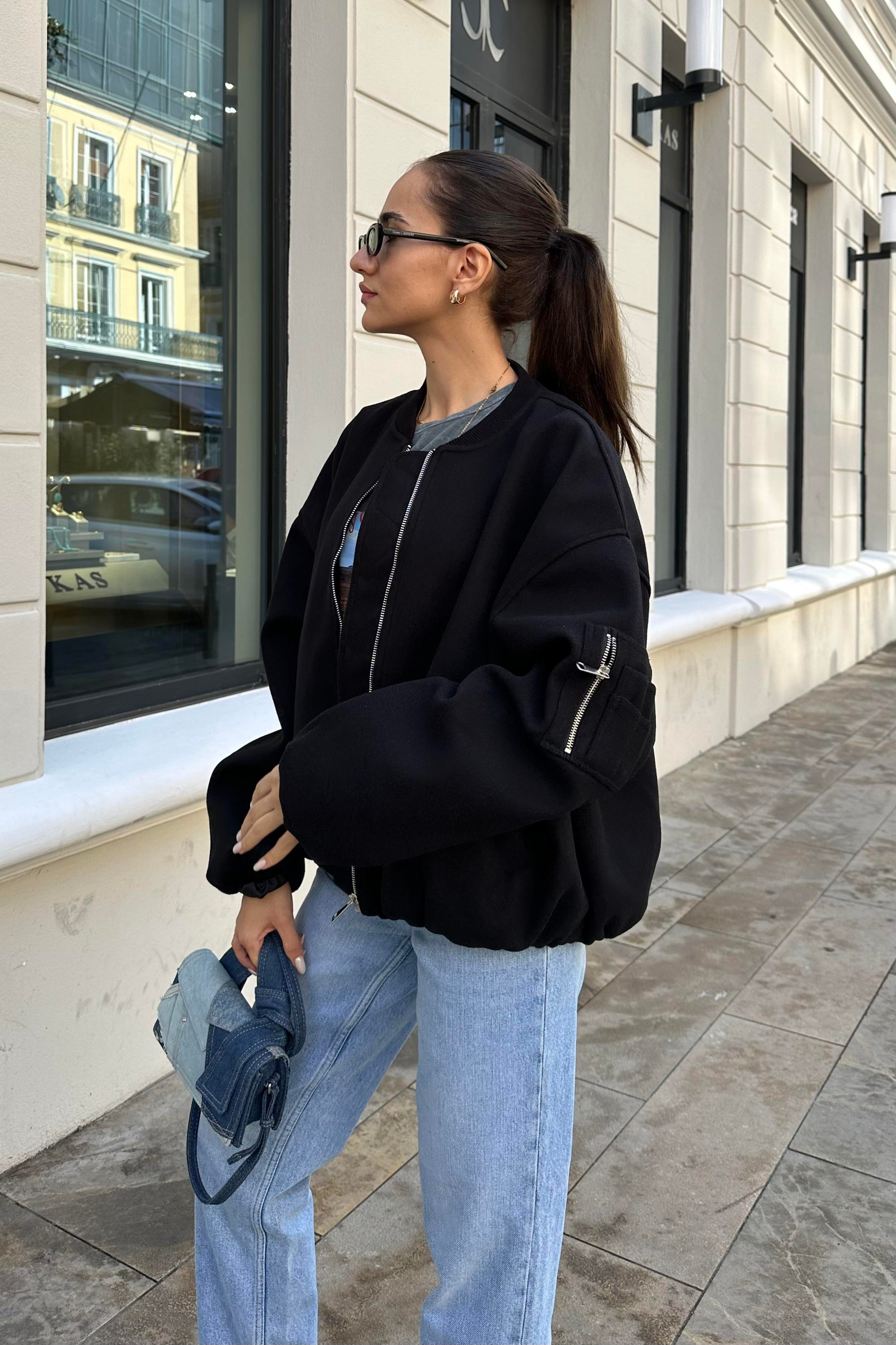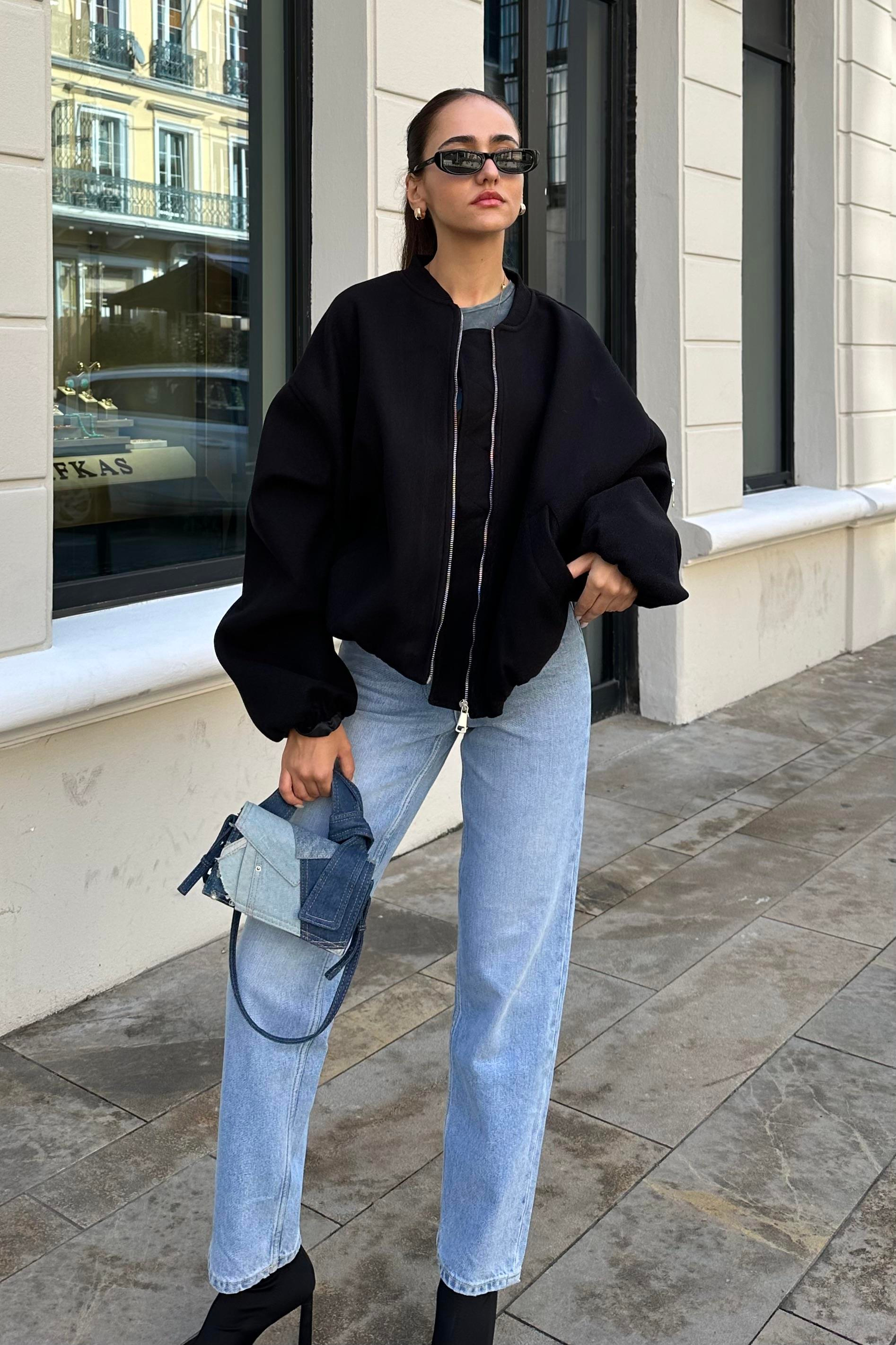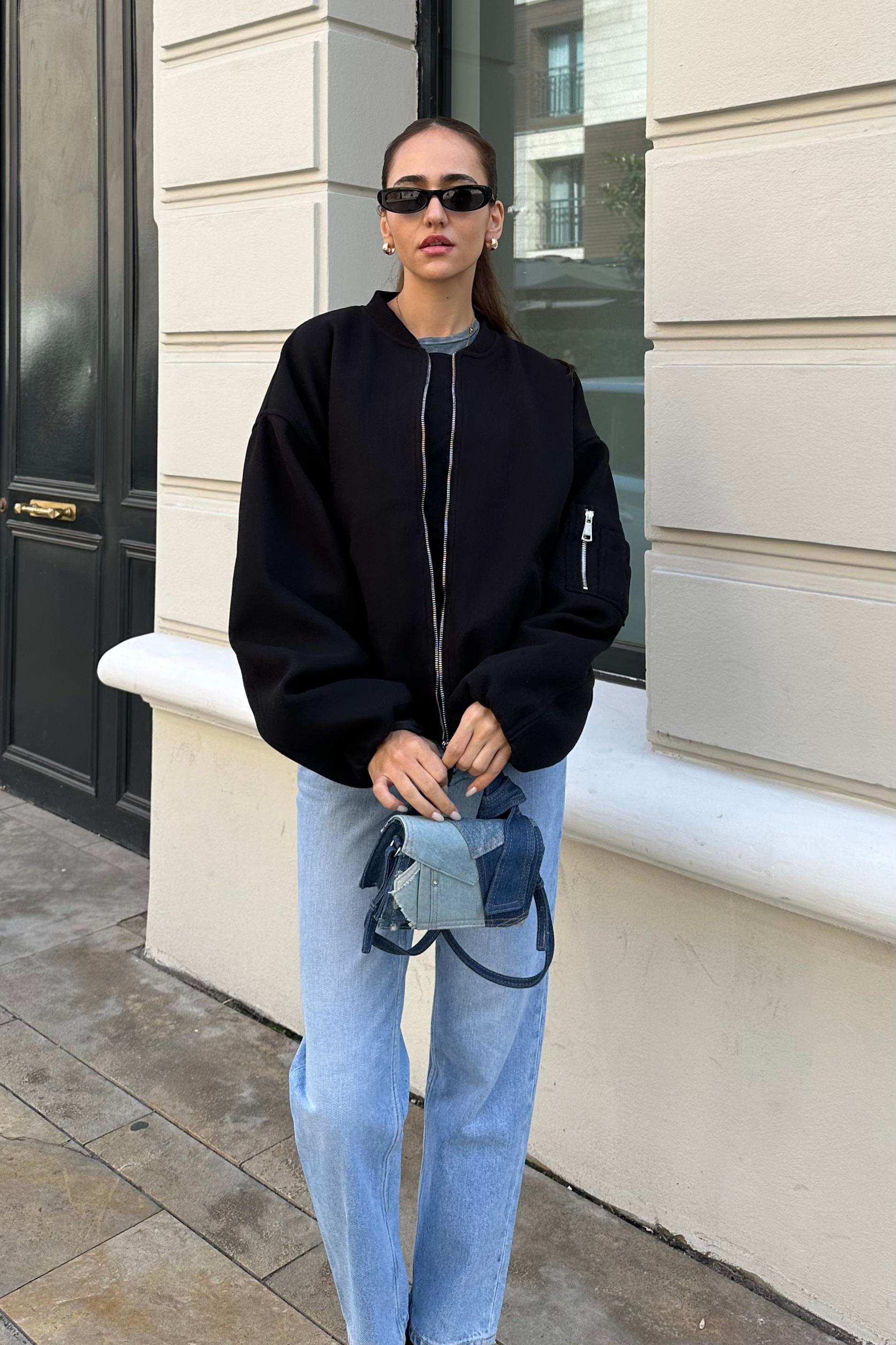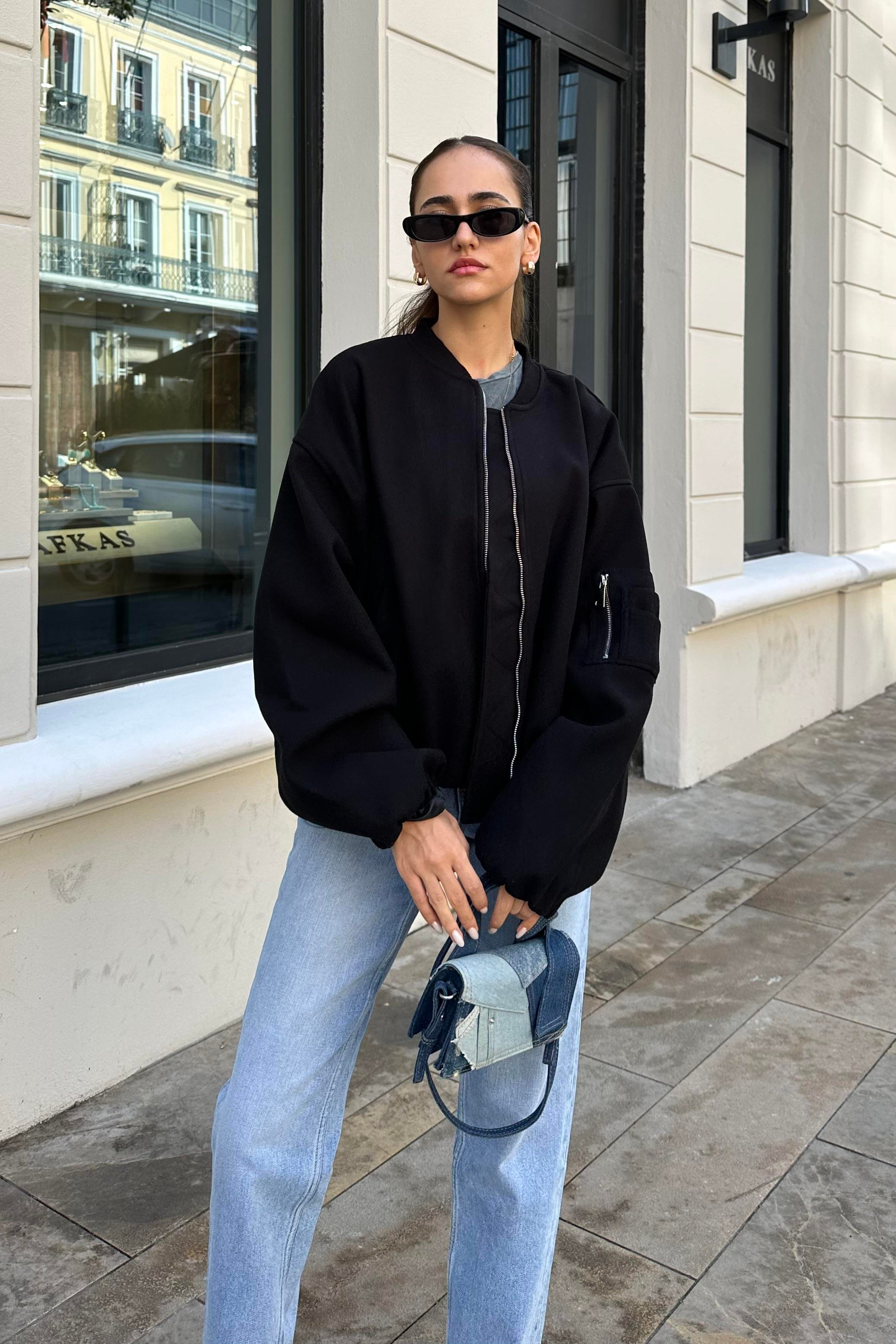 Black Oversized Stamp Bomber Jacket. %100 Cotton Stamp.  It is lined. It is oversized cut. The image is S size. Modal Size: Height:172cm Weight: 52 kg Waist:60 cm Hip: 90 cm.