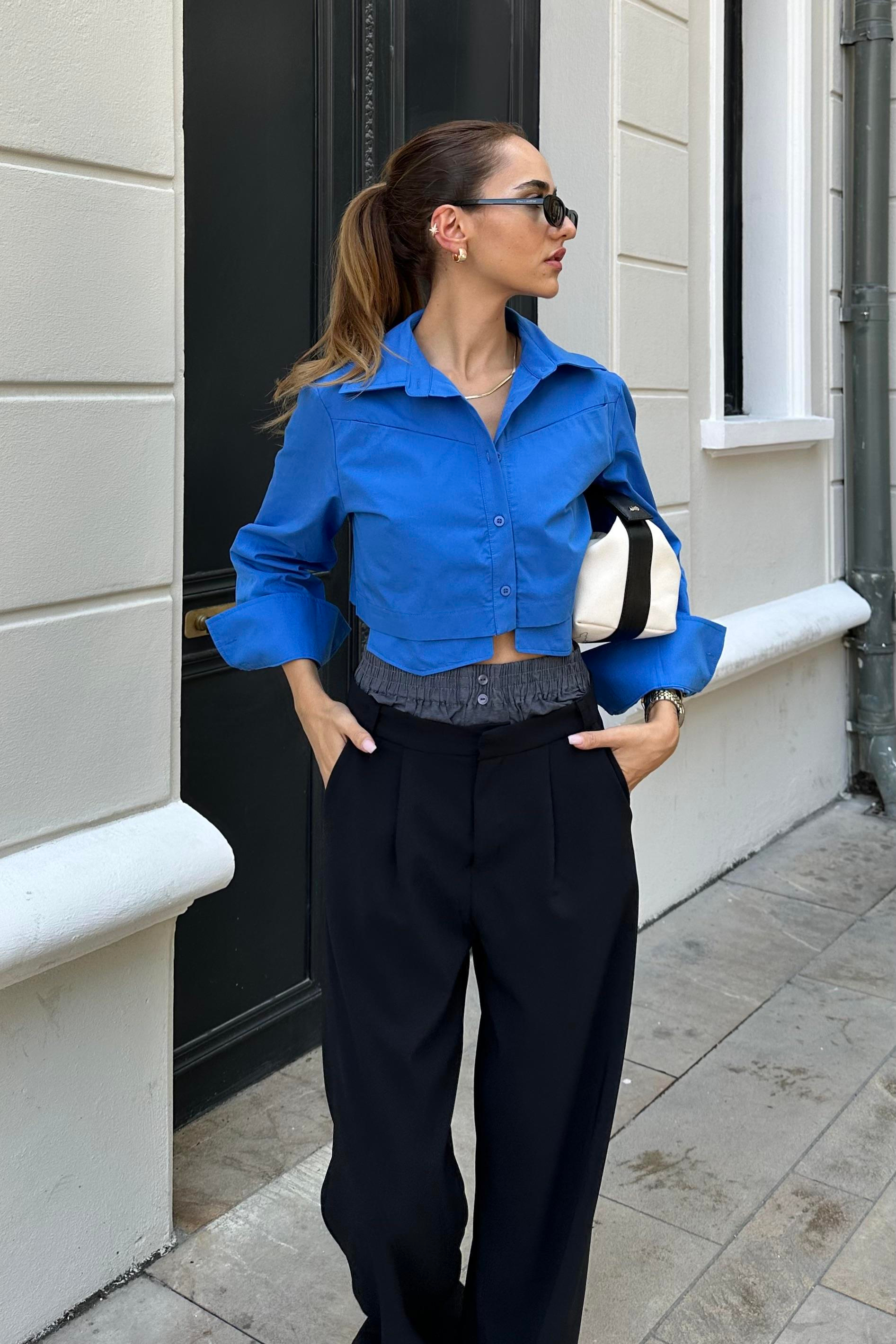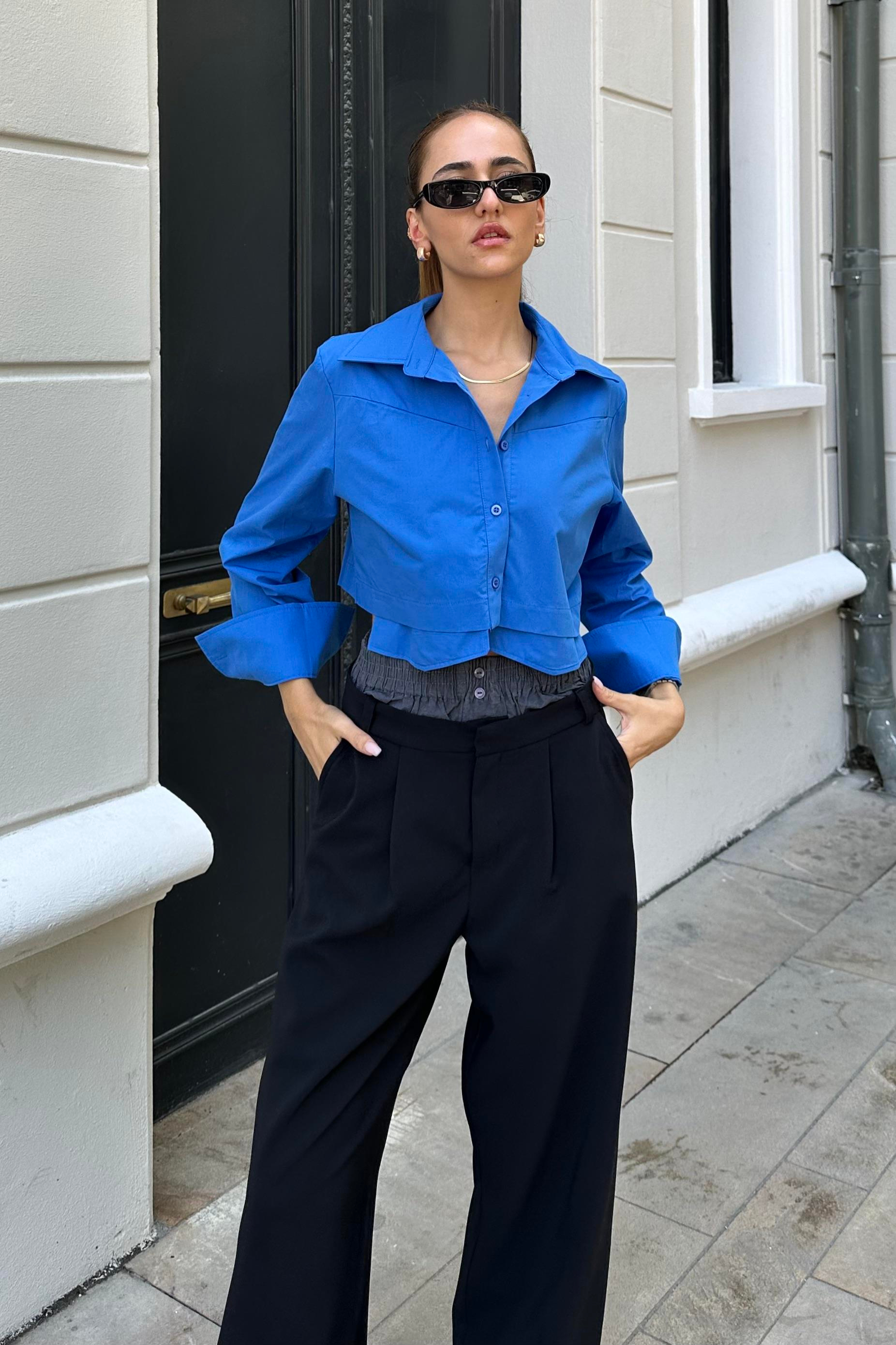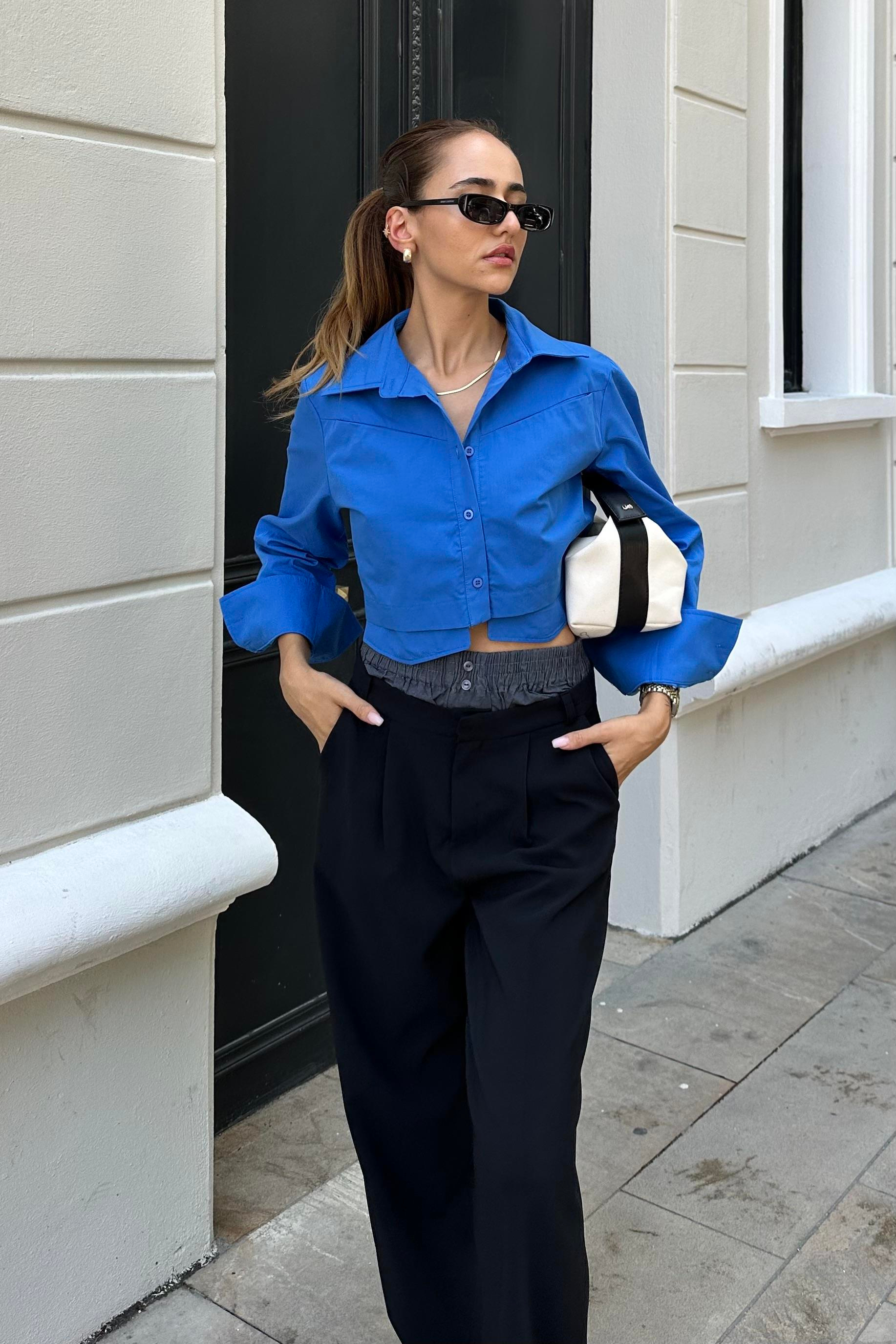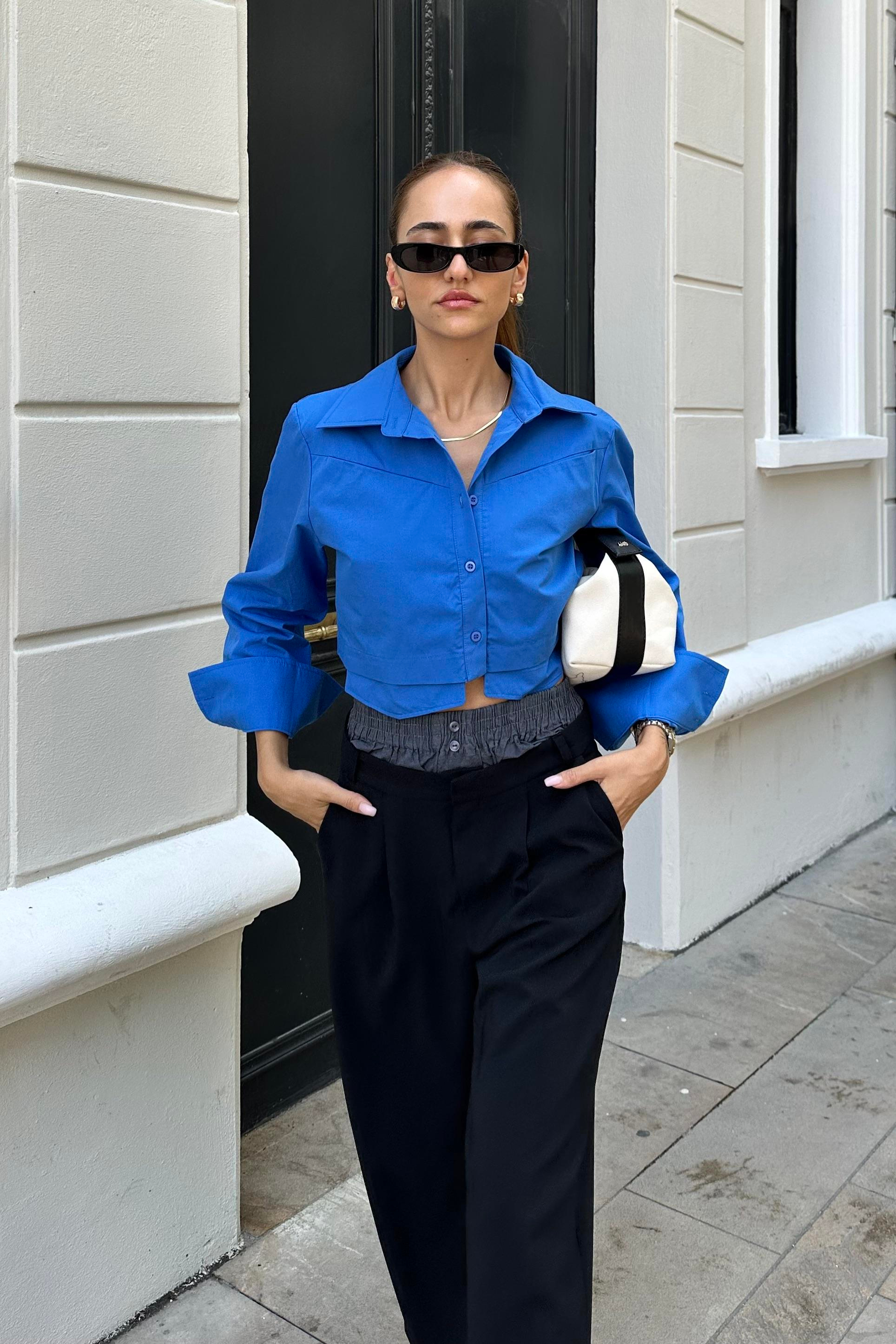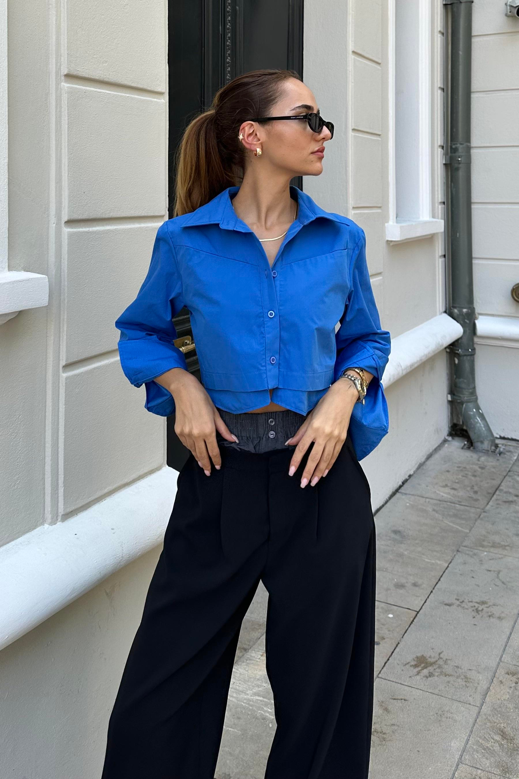 Blue Cropped Shirt. %100 Cotton. The image is S size. Modal Size: Height:172cm Weight: 52 kg Waist:61 cm Hip: 90 cm.