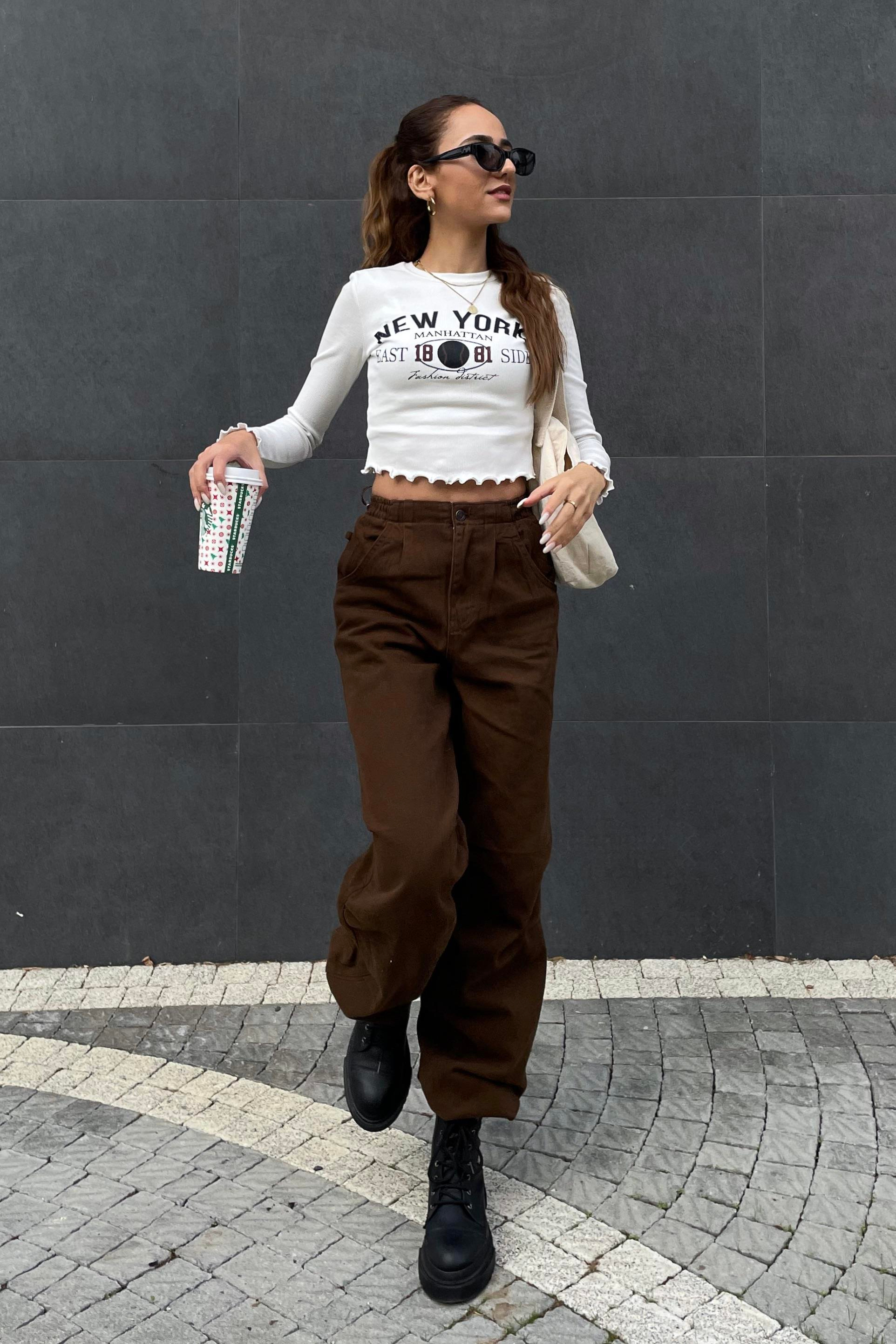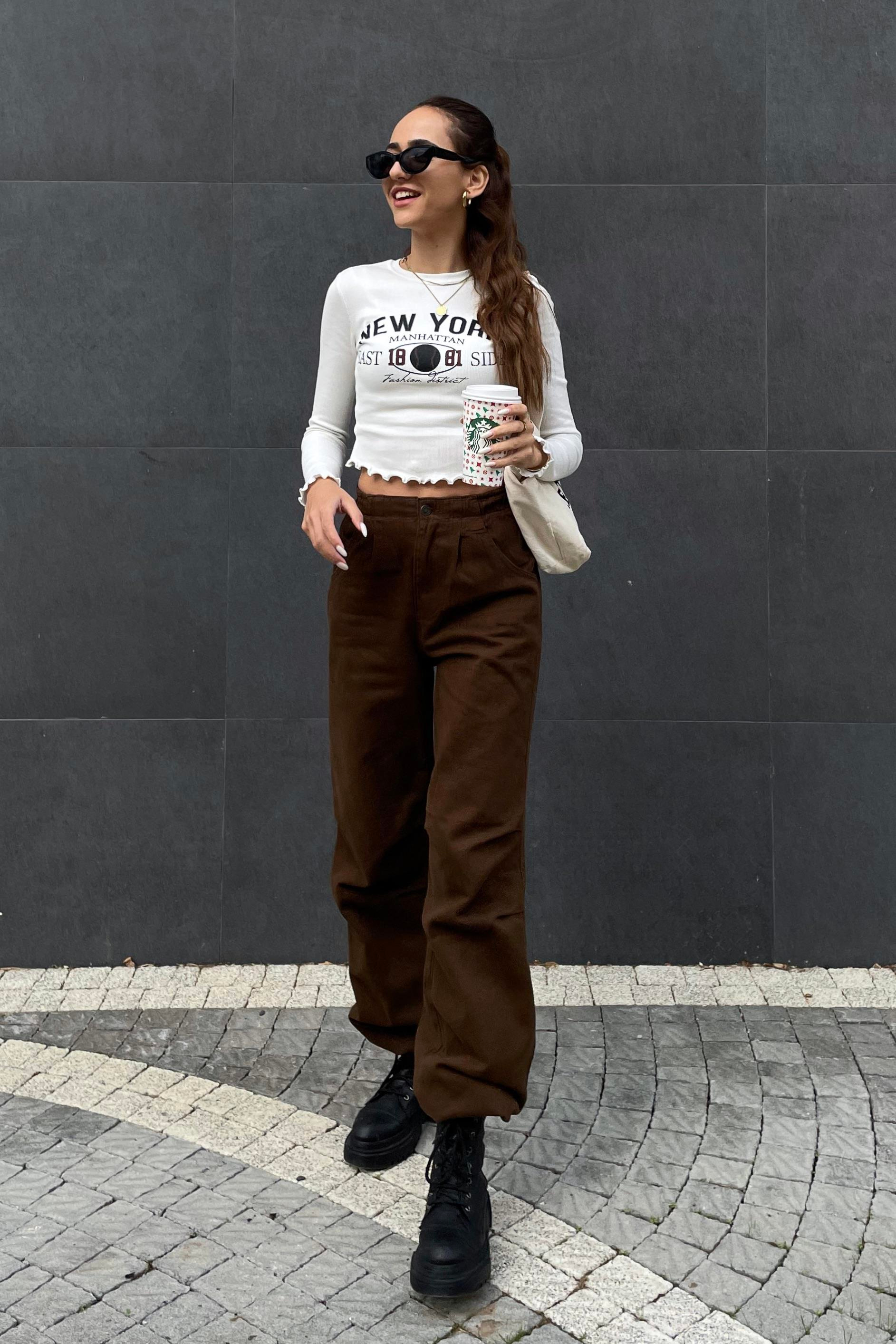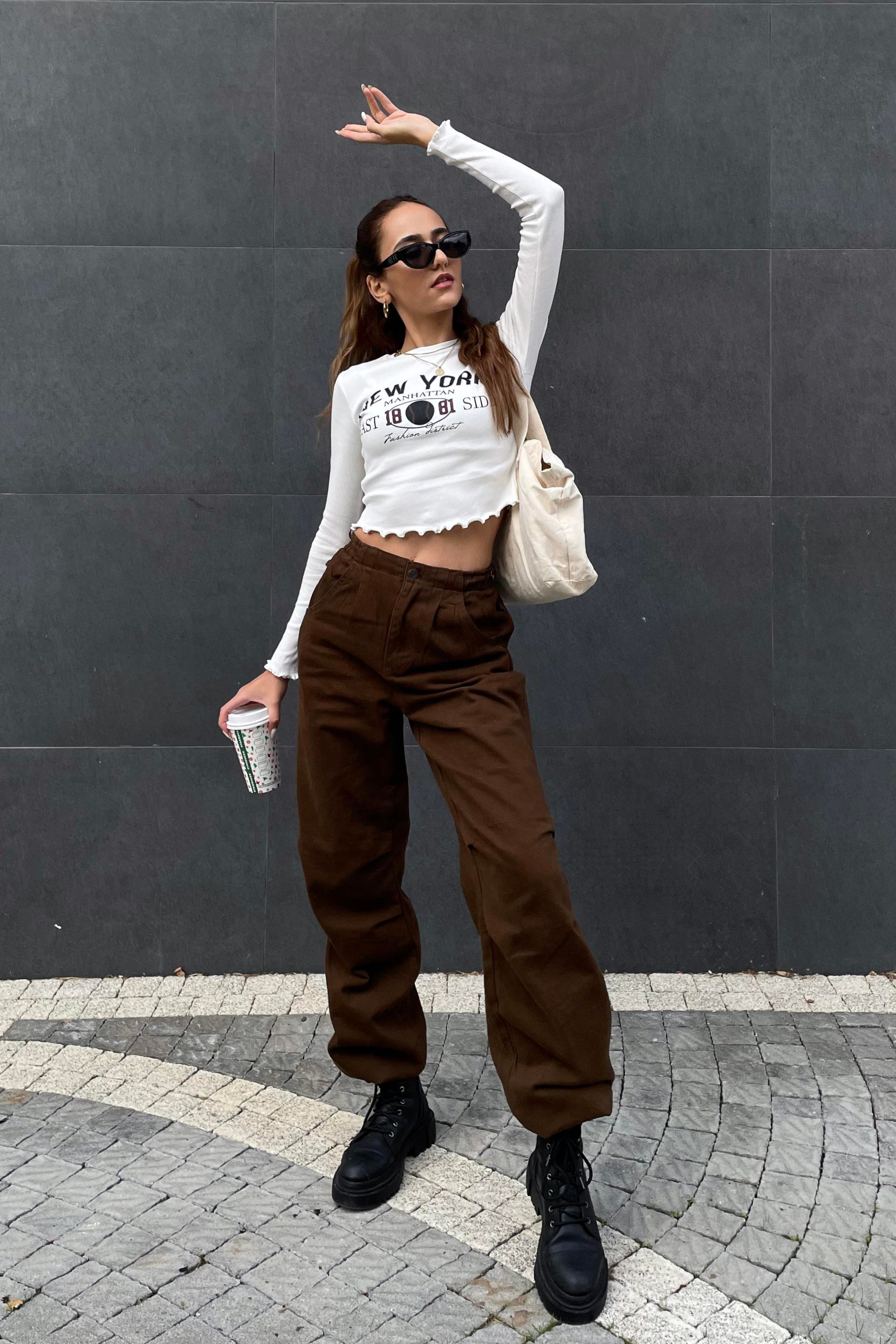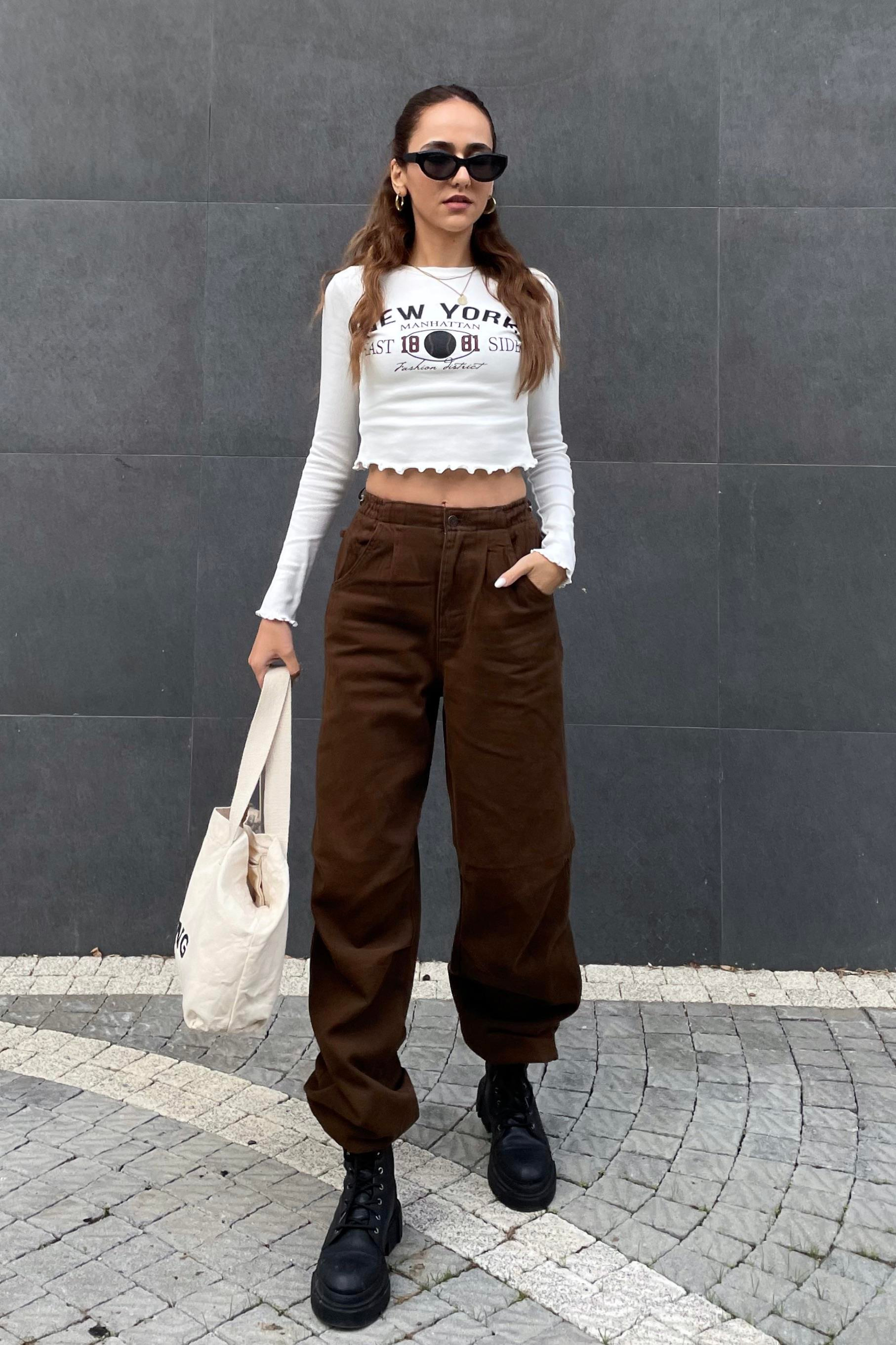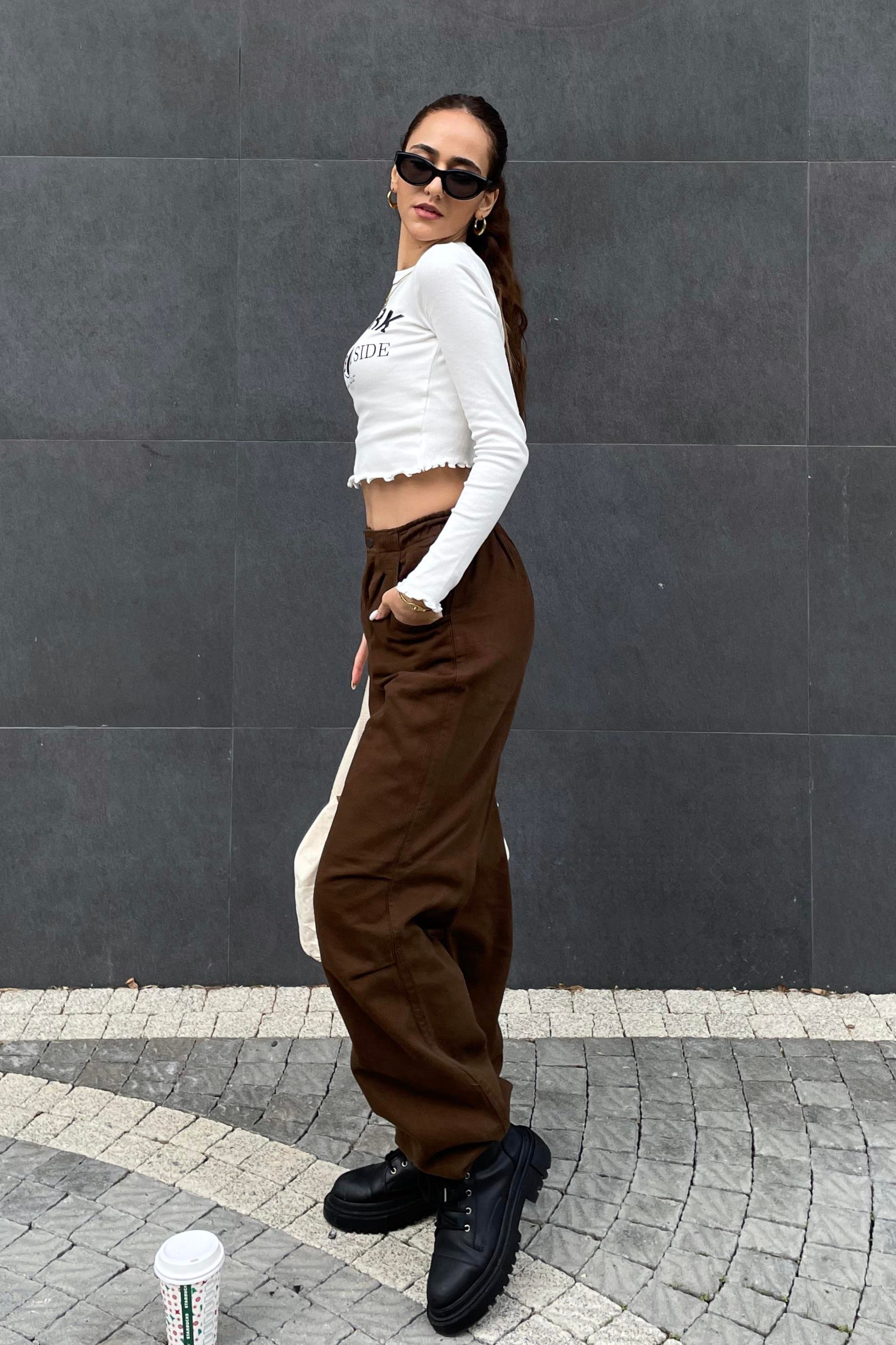 Brown Gabardine Jogger Trouser. %100 Cotton gabardine fabric. The image is XS size. Modal Size: Height:172 cm Weight: 52 kg Waist:61 cm Hip: 90 cm.