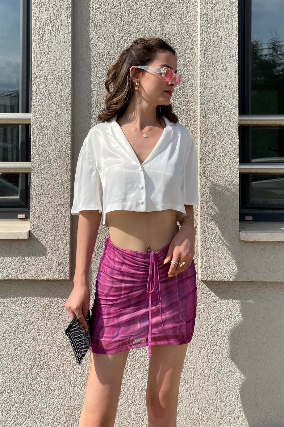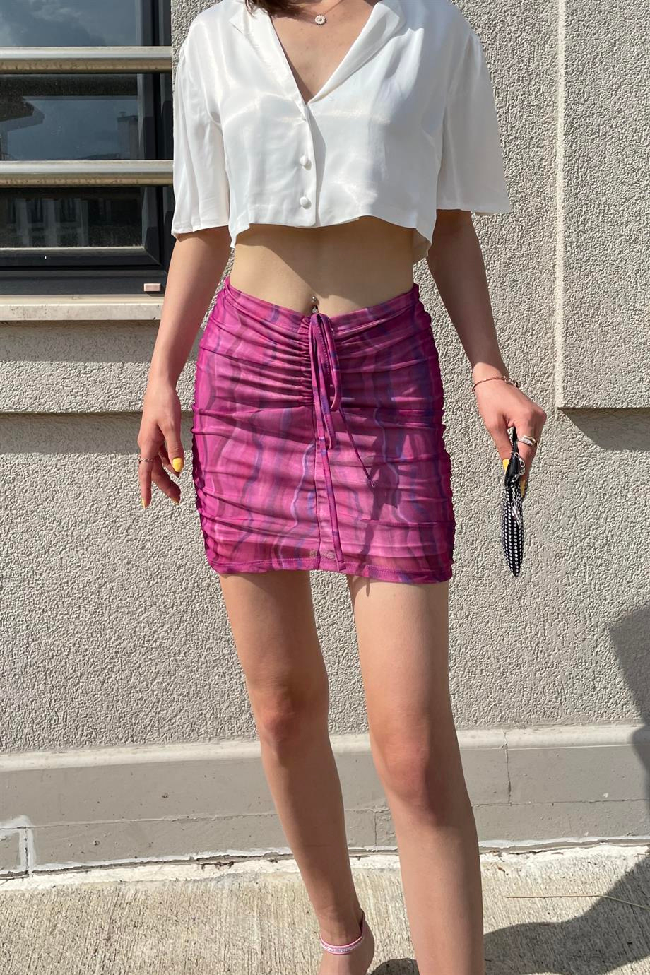Dusty Rose Gathered Tulle Mini Skirt. The product is from orginal Na-Ked brand. It is lined. The image is XS size. Modal Size: Height:175 cm Weight: 56 kg Waist:62 cm Hip:92 cm.