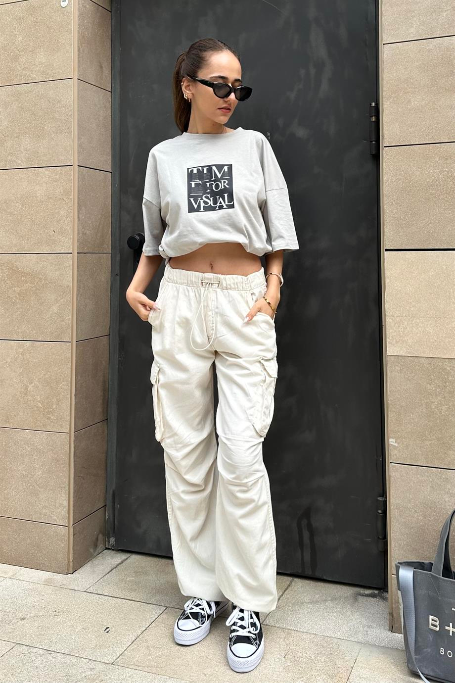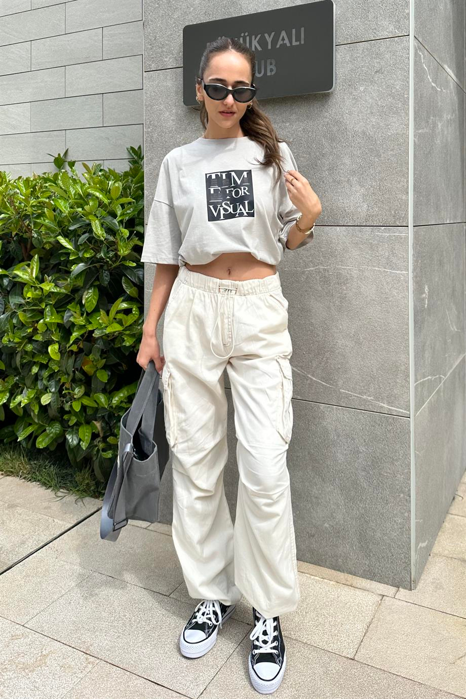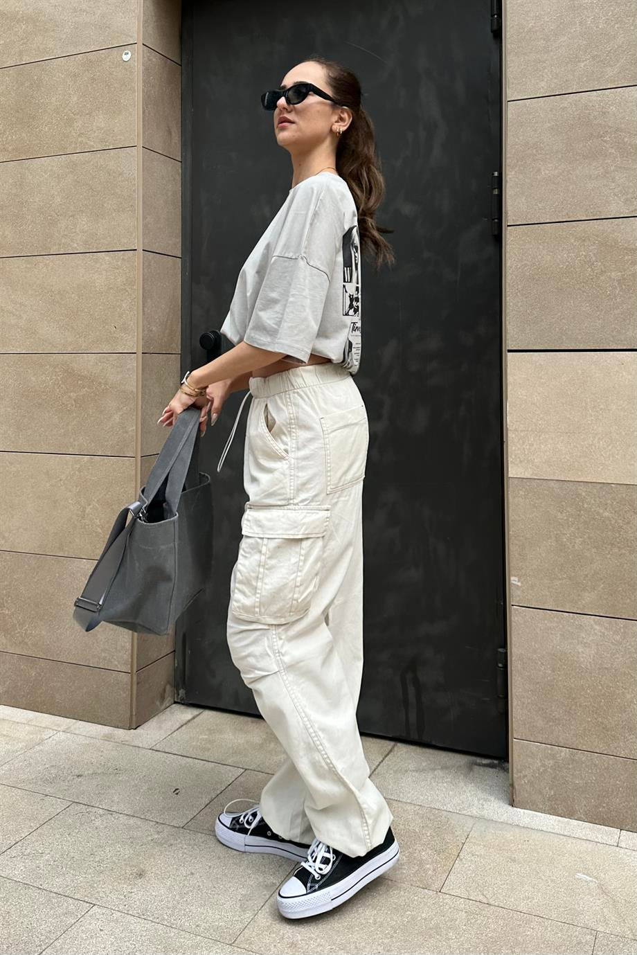 Ecru Cargo Jogger Trouser. %100 Cotton. The image is XS size. Modal Size: Height:172 cm Weight: 52 kg Waist:61 cm Hip: 90 cm.