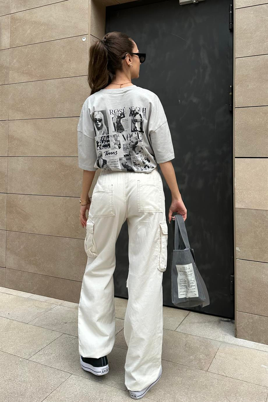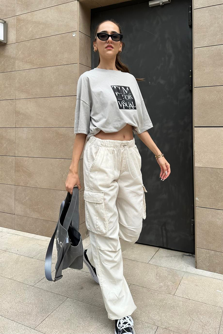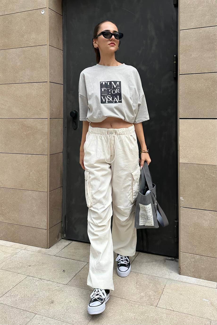 Ecru Cargo Jogger Trouser. %100 Cotton. The image is XS size. Modal Size: Height:172 cm Weight: 52 kg Waist:61 cm Hip: 90 cm.