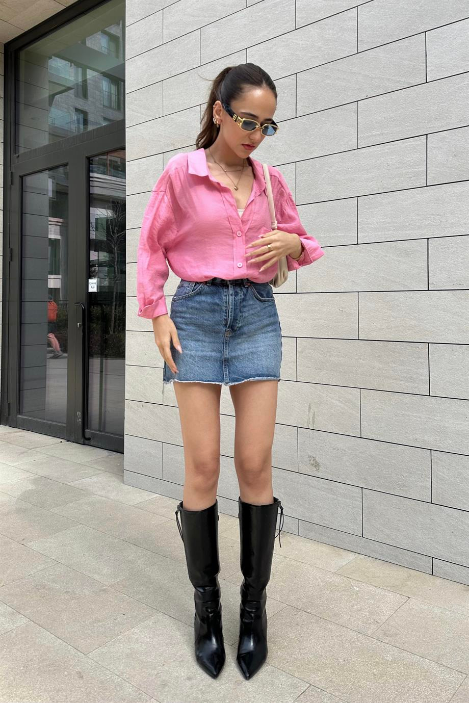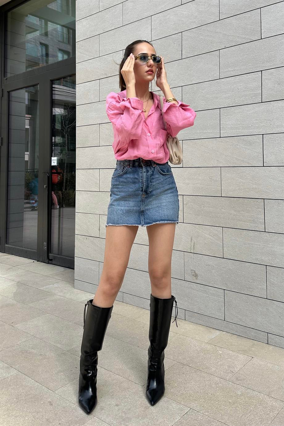 Indigo Blue Jean Mini Skirt. %100 Cotton. The image is S size. Modal Size: Height:172 cm Weight: 52 kg Waist:61 cm Hip: 90 cm.