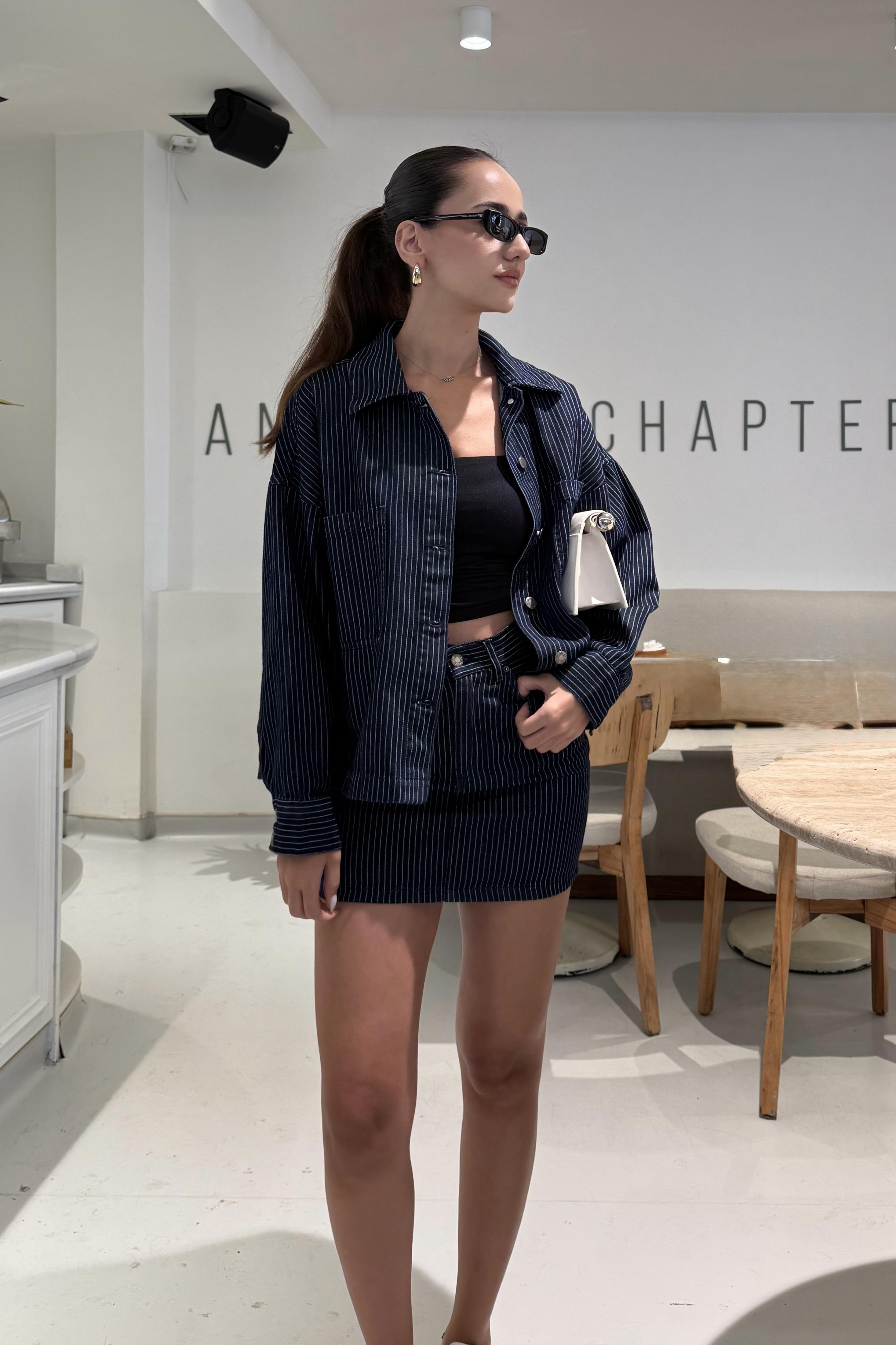 İndigo Mavi Çizgi Baskılı Premium Jean Etek (NZL11011)