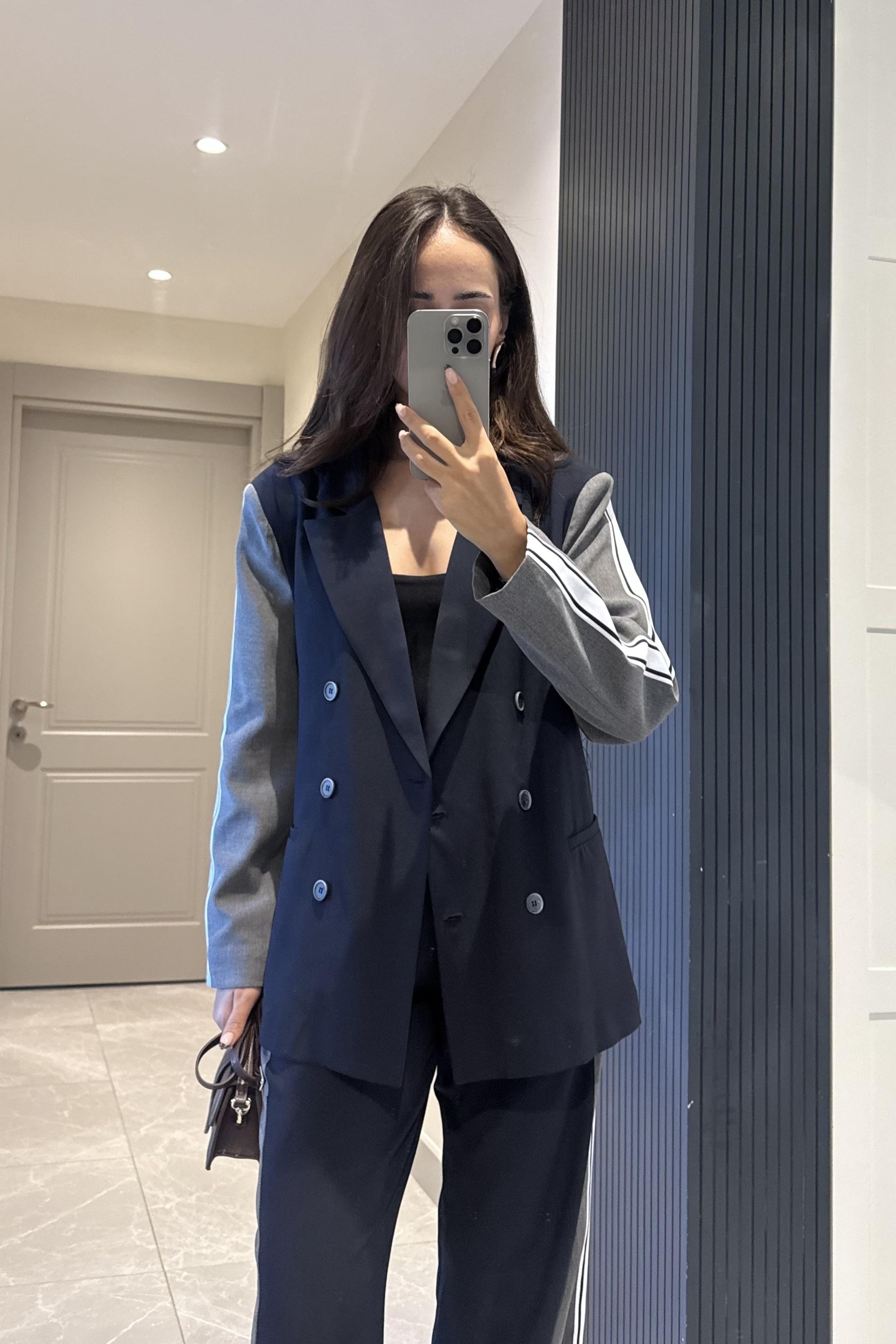 Lacivert Şerit Detay Tasarım Blazer Ceket. %100 Pamuk. Görsel M bedendir. Model Ölçüleri: Boy:172 cm Kilo: 52 kg Bel: 61 cm Basen: 90 cm.