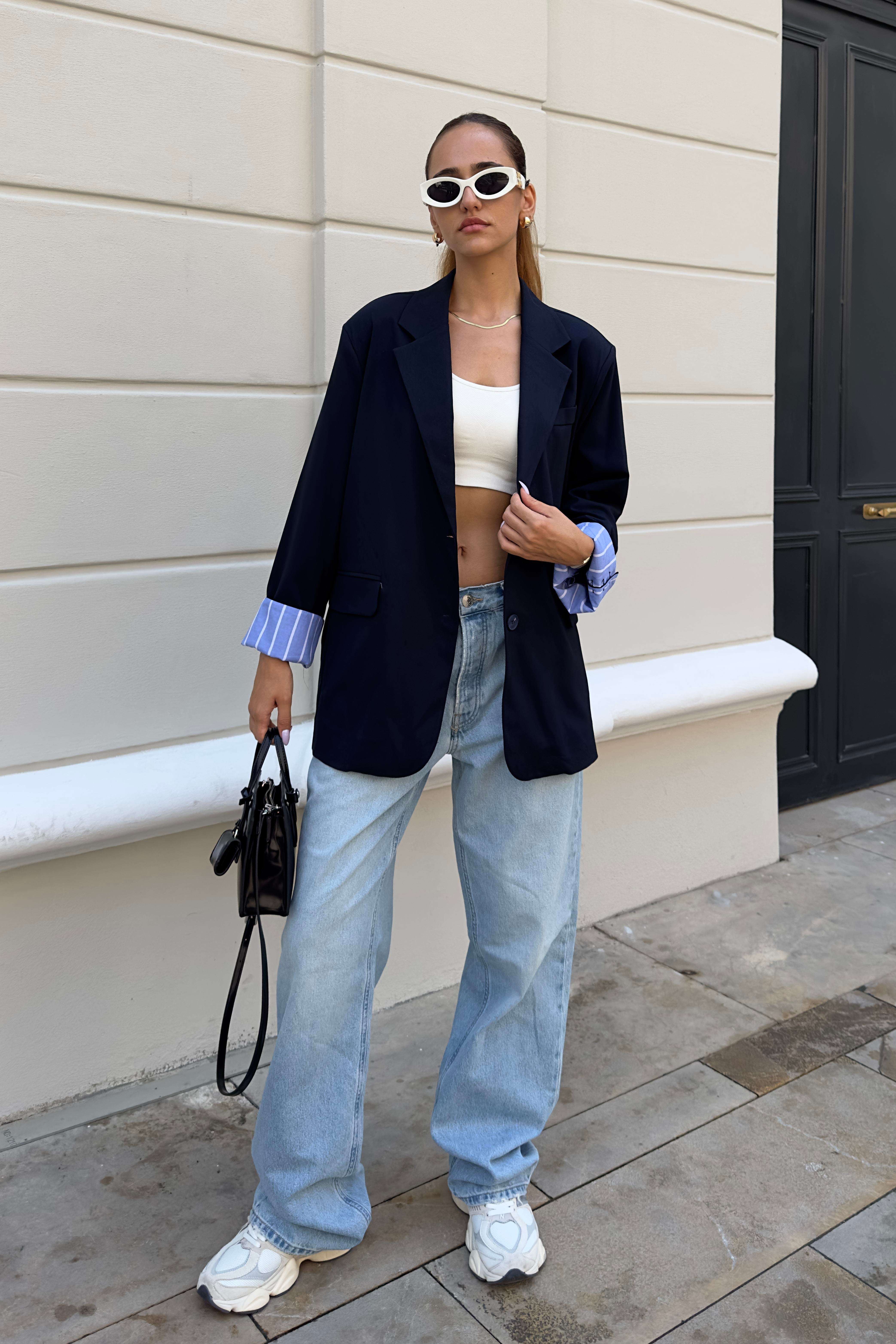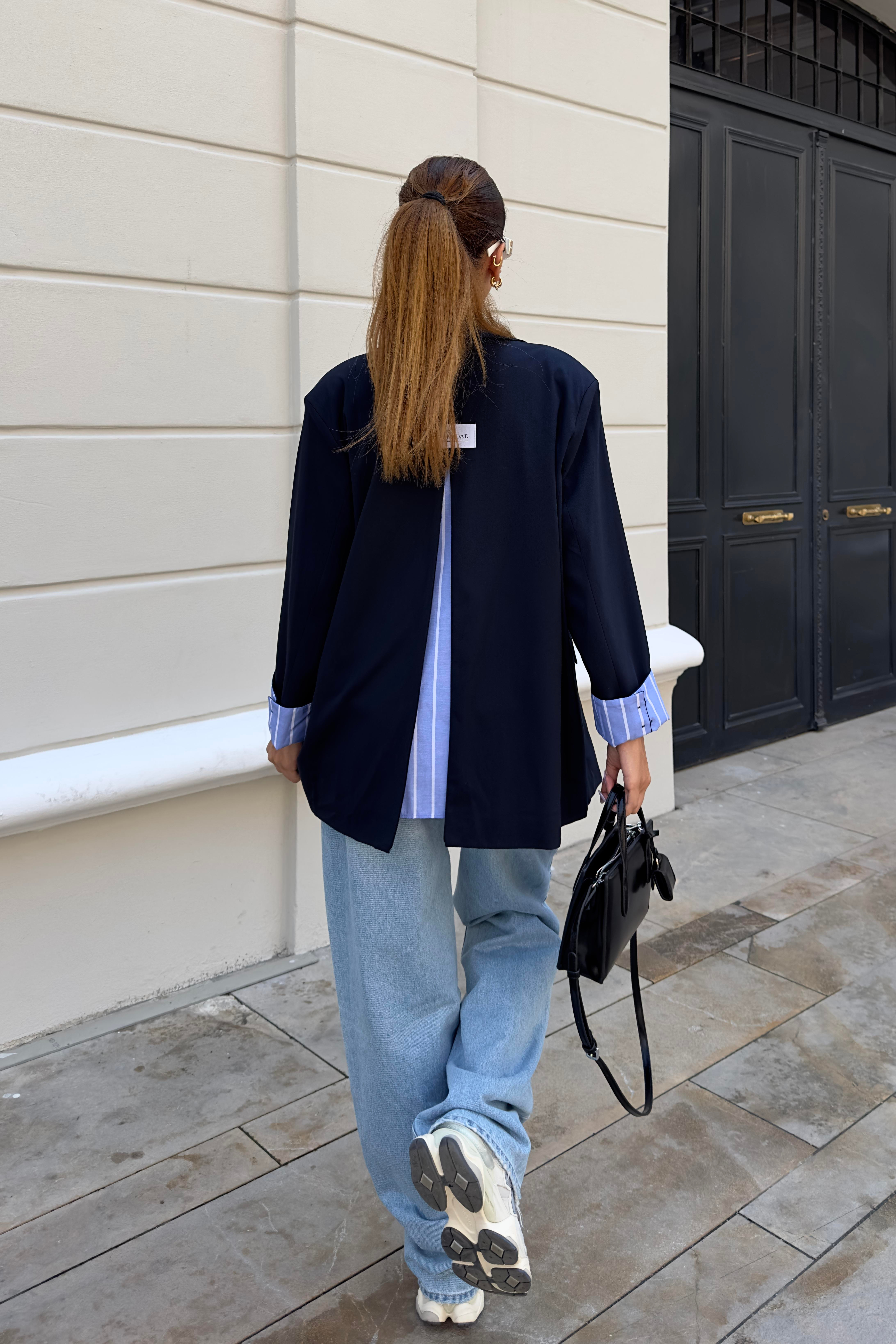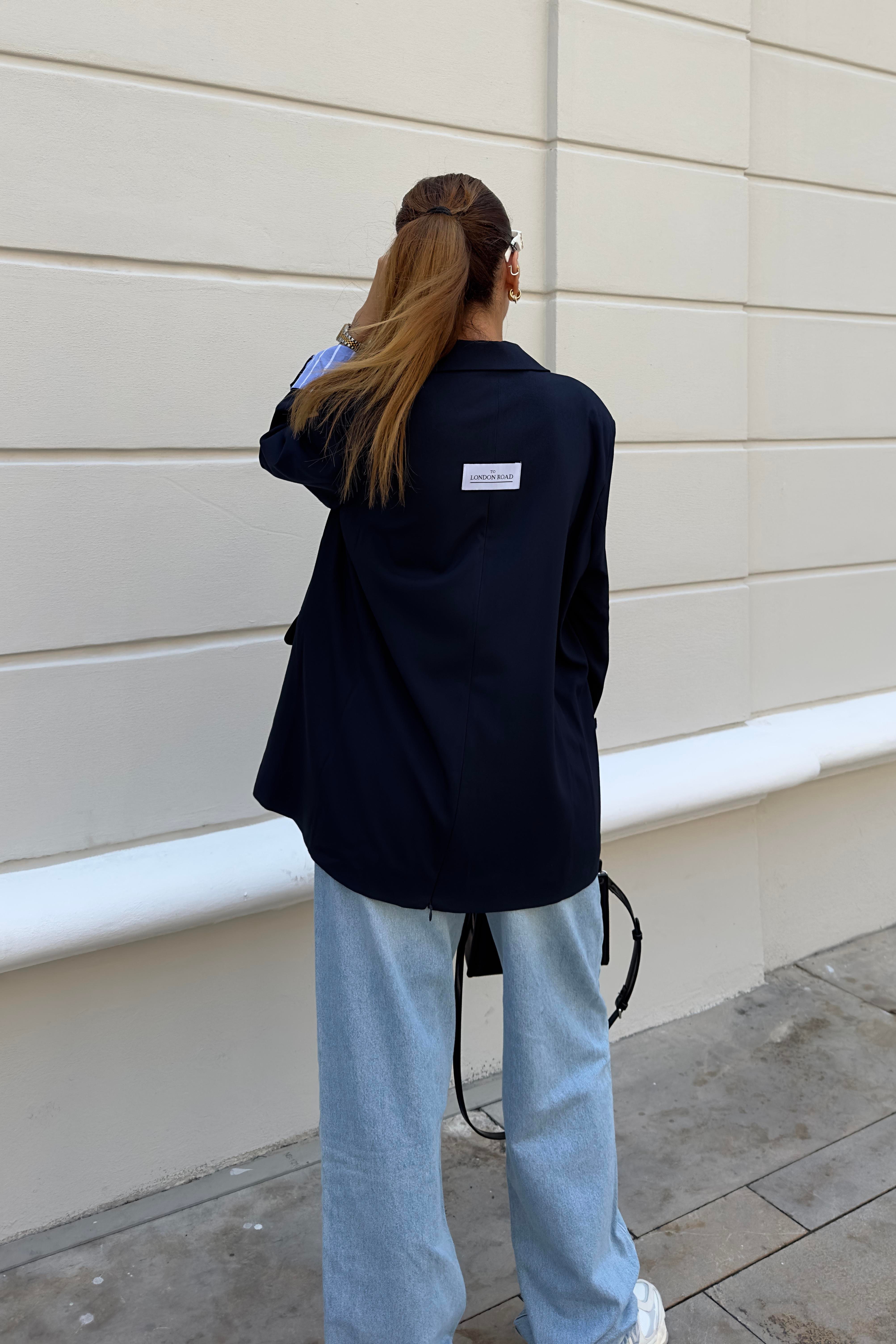 Navy Blue Design Oversized Blazer Jacket. %100 Cotton. It is oversized cut. It has zip detail on the back. The image is S size. Modal Size: Height:172 cm Weight: 52 kg Waist:61 cm Hip: 90 cm.