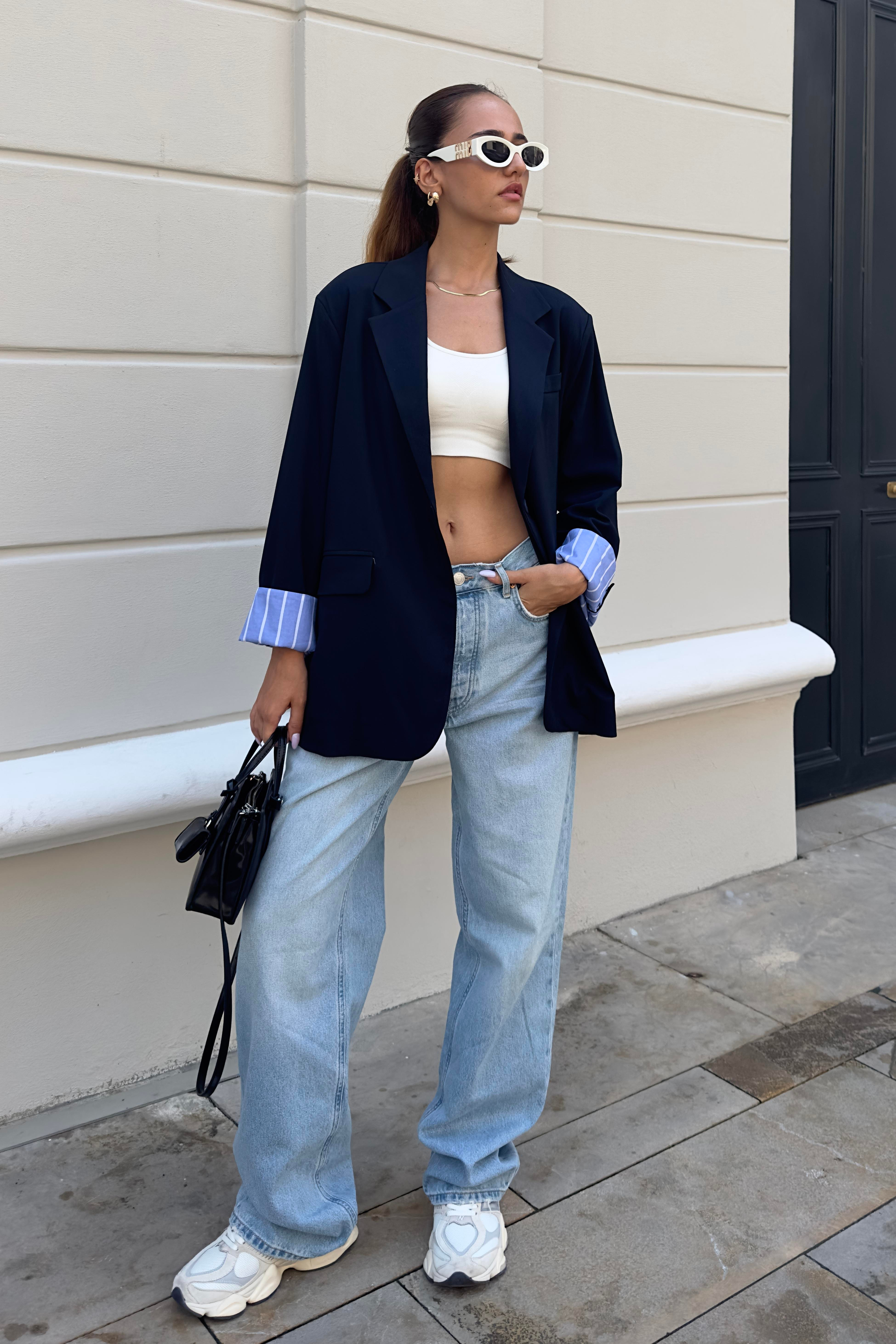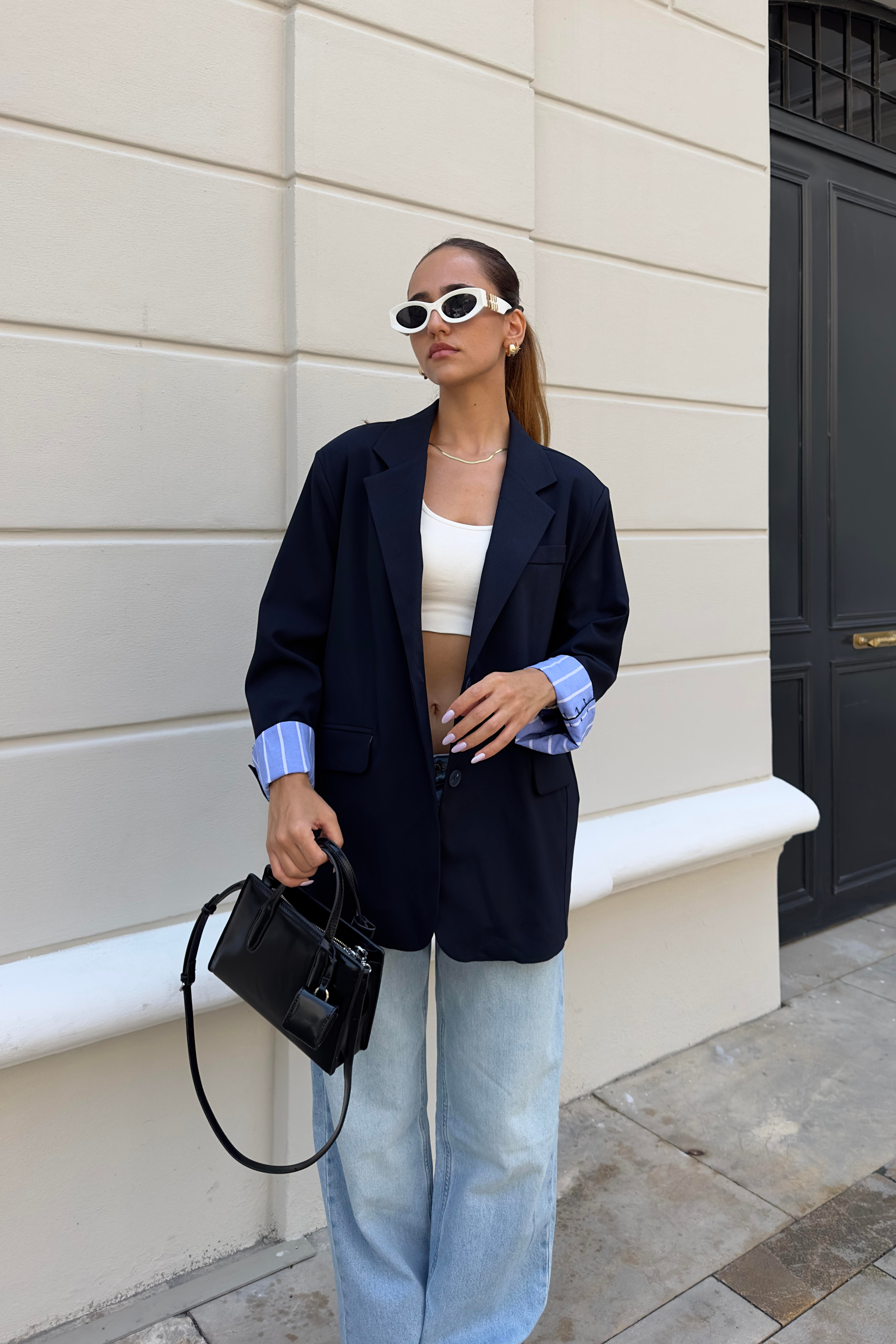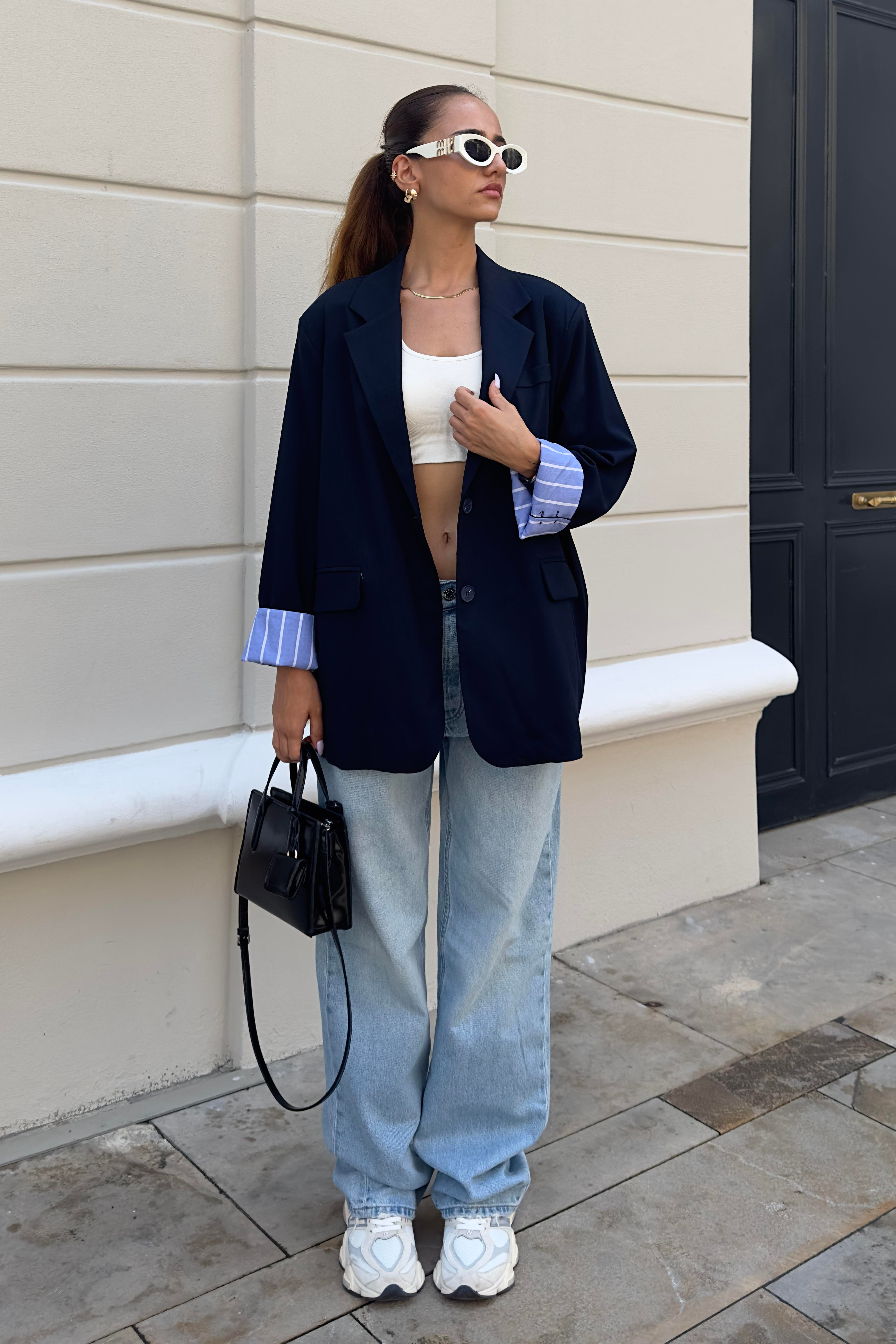 Navy Blue Design Oversized Blazer Jacket. %100 Cotton. It is oversized cut. It has zip detail on the back. The image is S size. Modal Size: Height:172 cm Weight: 52 kg Waist:61 cm Hip: 90 cm.
