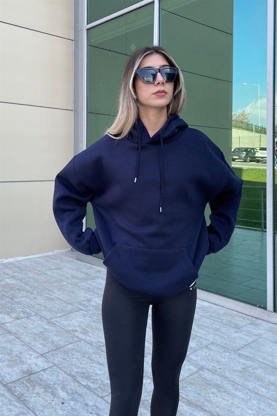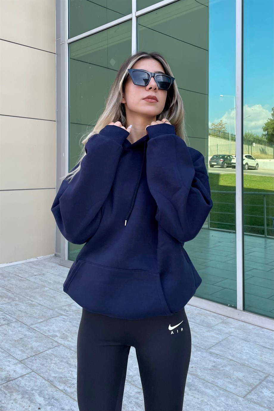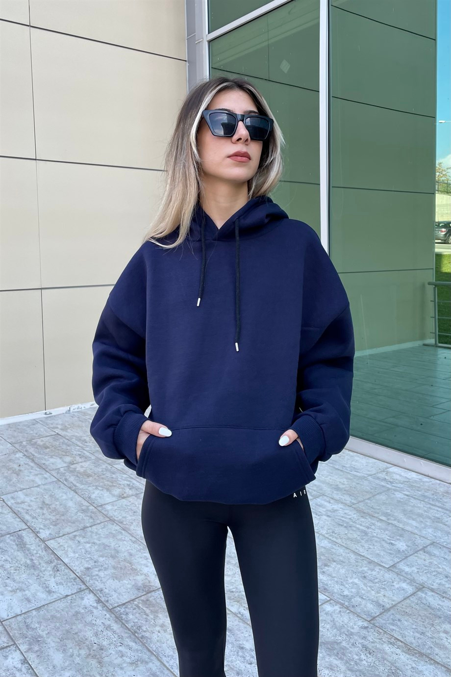 Navy Blue Hooded Raised Cloth Sweatshirt . %100 Cotton.The image is S size. Three Thread Fabric and Softy Touch. Product Length: 67 cm. Modal Size: Height:172 cm Weight: 52 kg Waist:61 cm Hip:90 cm.