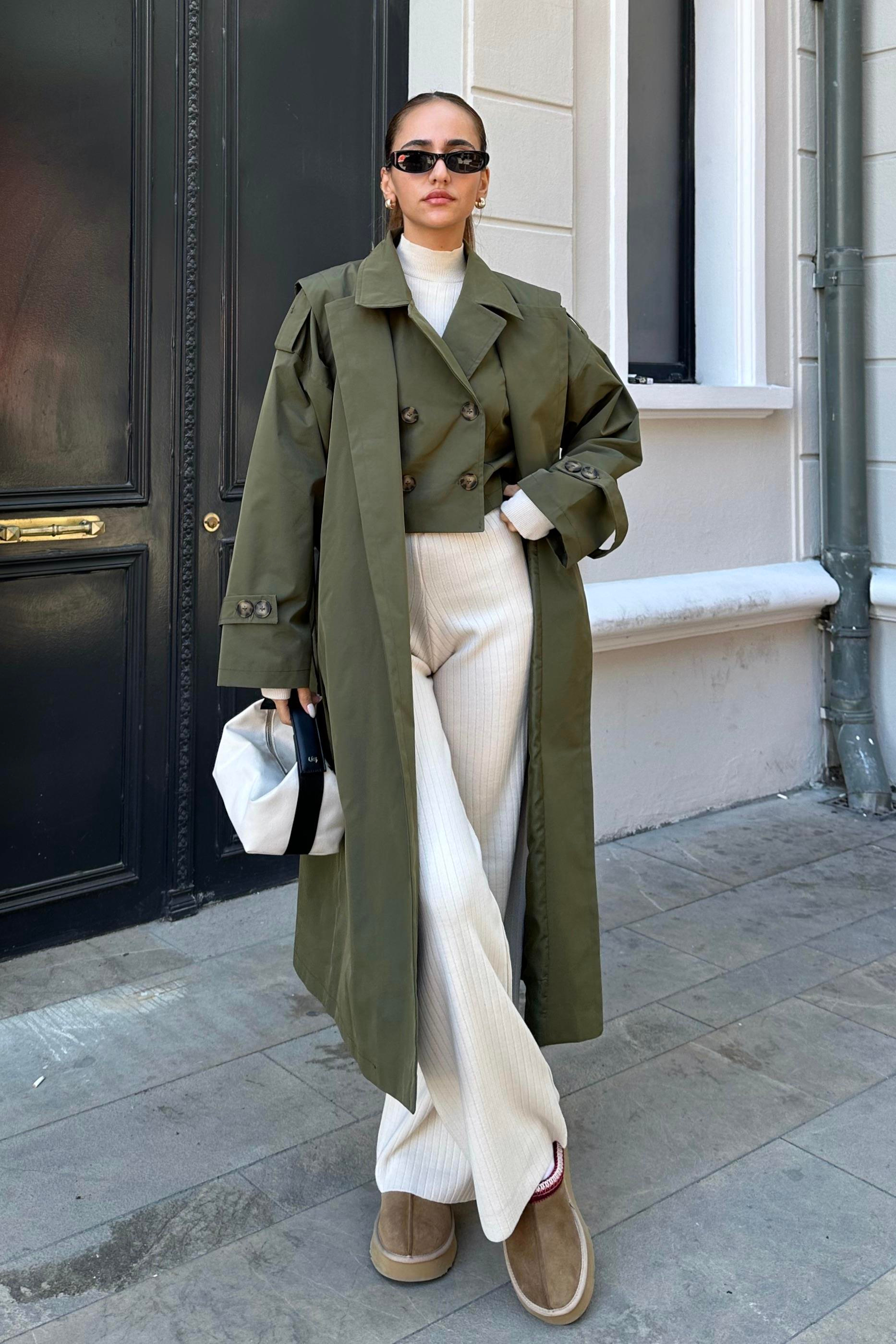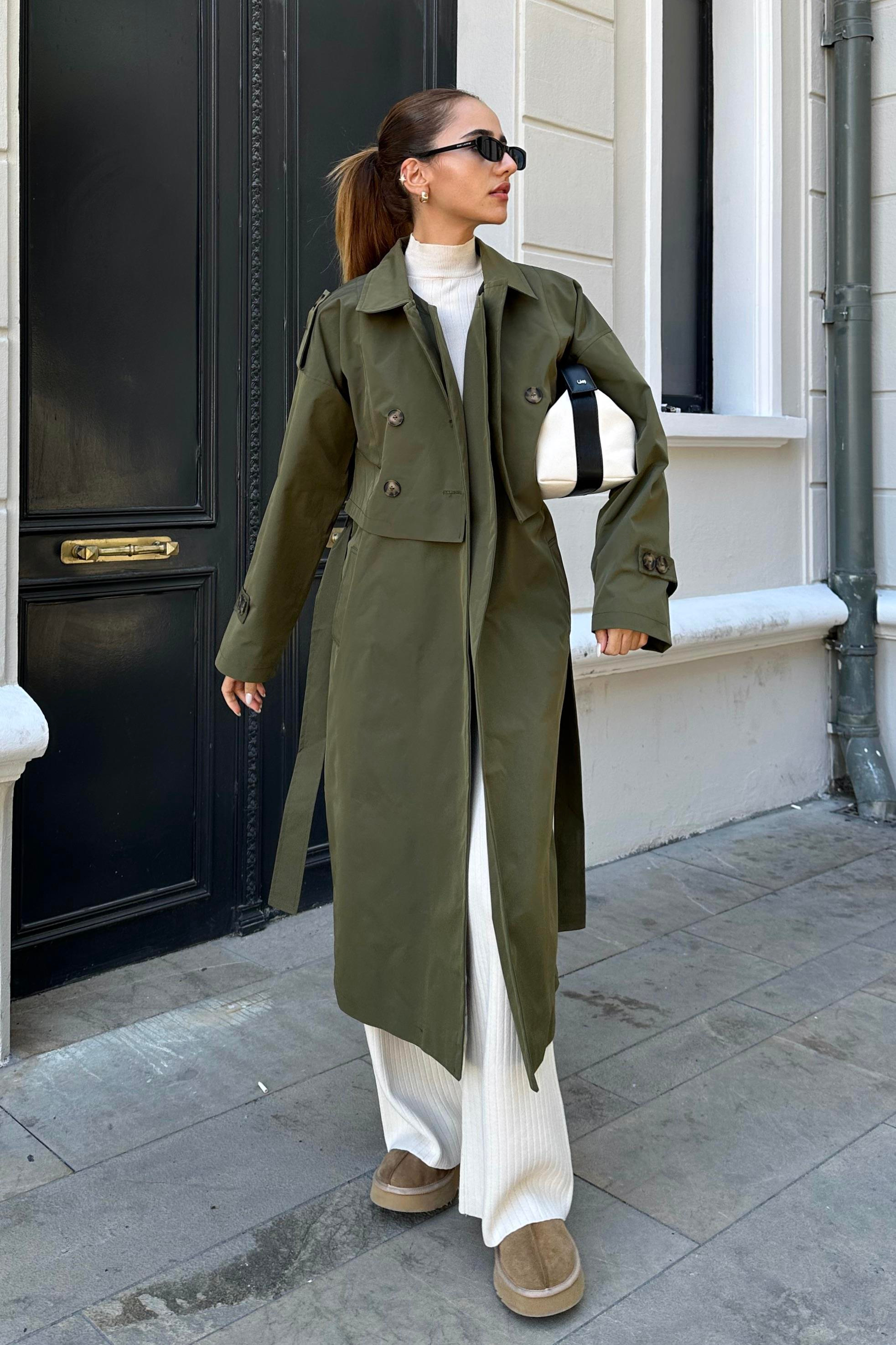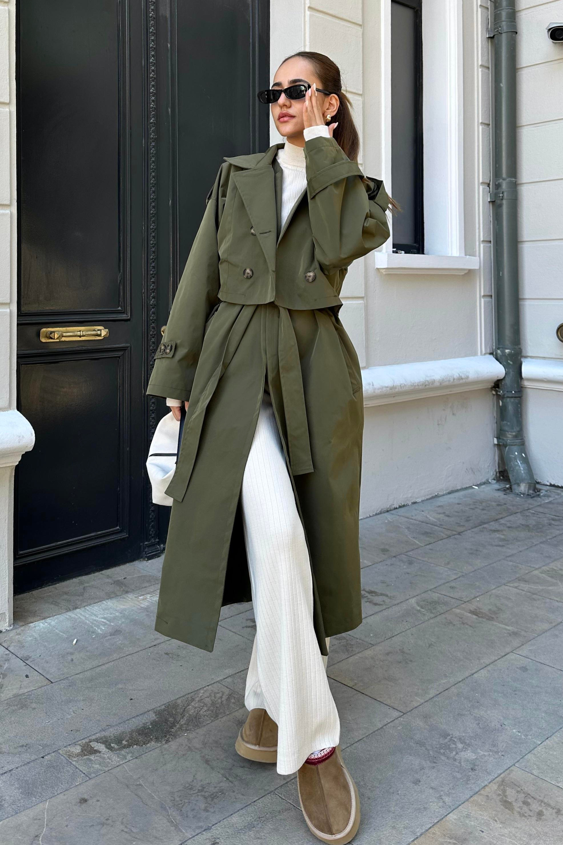 Nazliye Green Design Trench Coat. %100 Cotton. It is imported. It has buttoned closing, lining and belt. It can be used as long and cropped trench coat. The image is STD size. Product Length: 125 cm. Modal Size: Height:172 cm Weight: 52 kg Waist:60 cm Hip: 90 cm.