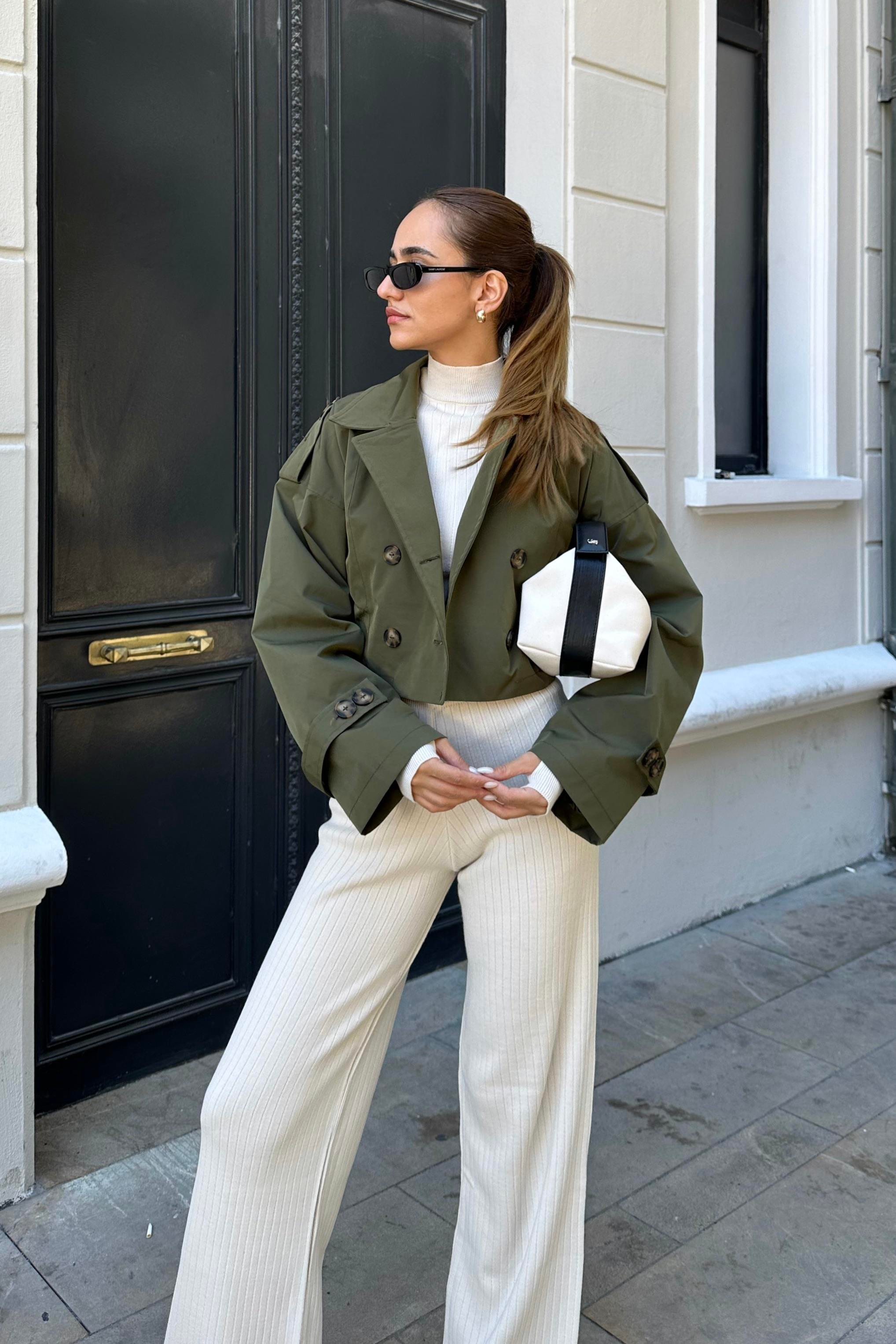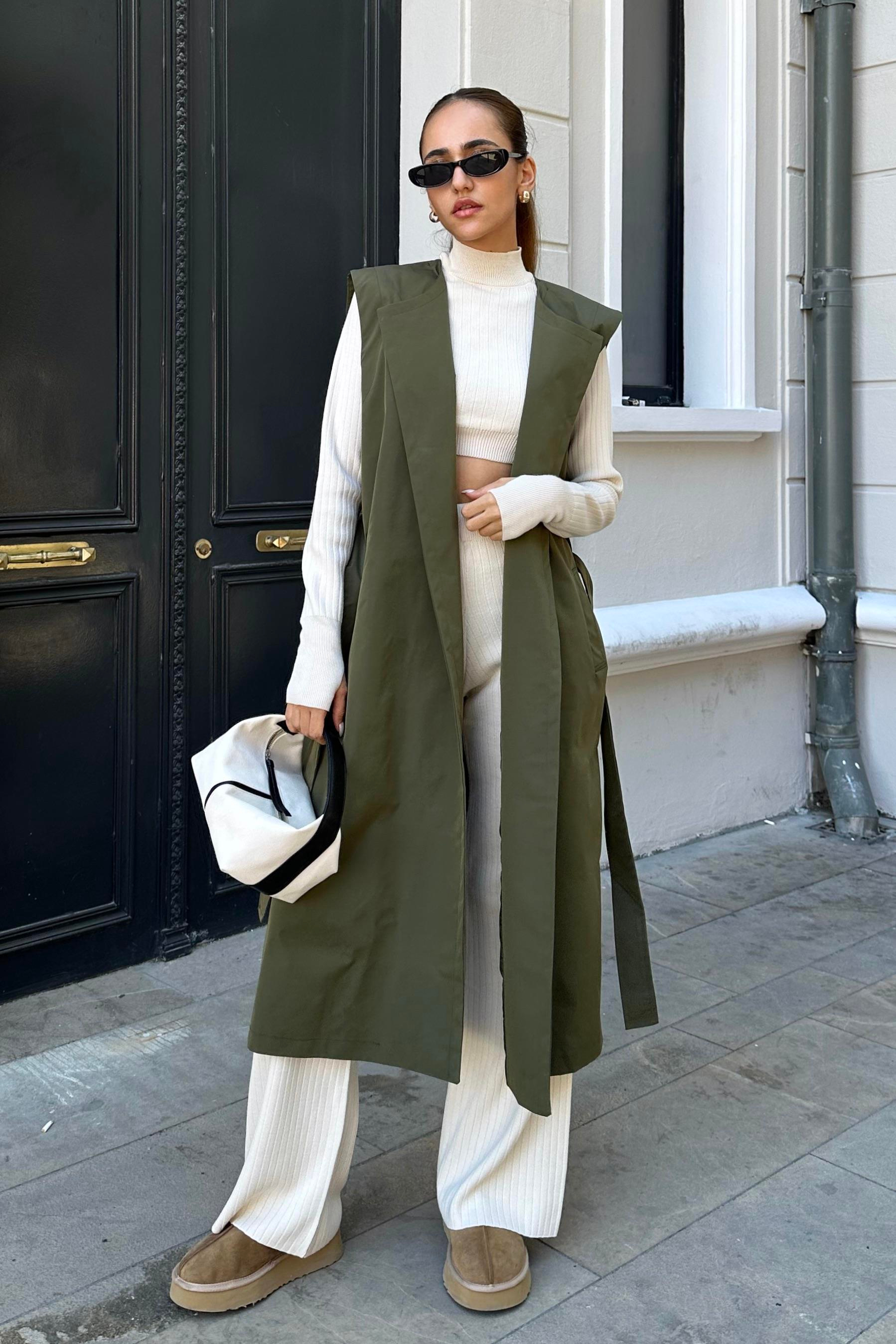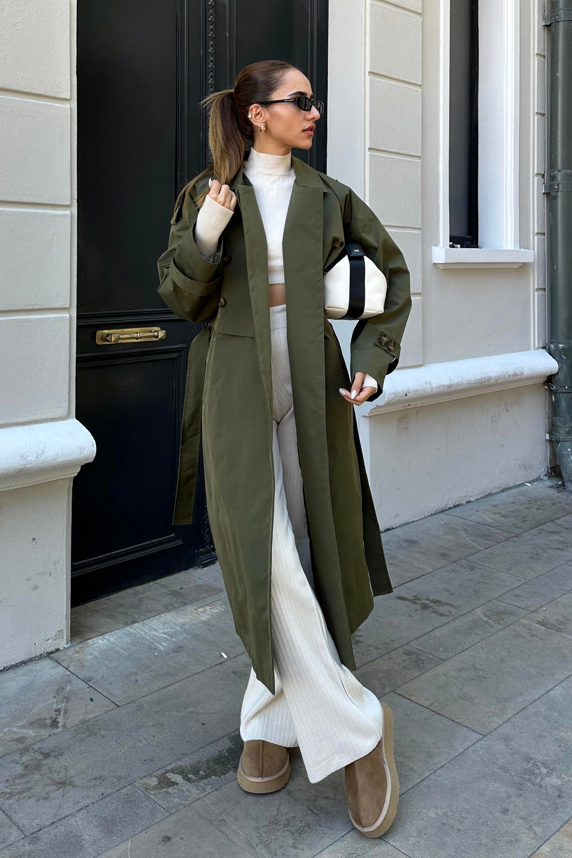 Nazliye Green Design Trench Coat. %100 Cotton. It is imported. It has buttoned closing, lining and belt. It can be used as long and cropped trench coat. The image is STD size. Product Length: 125 cm. Modal Size: Height:172 cm Weight: 52 kg Waist:60 cm Hip: 90 cm.