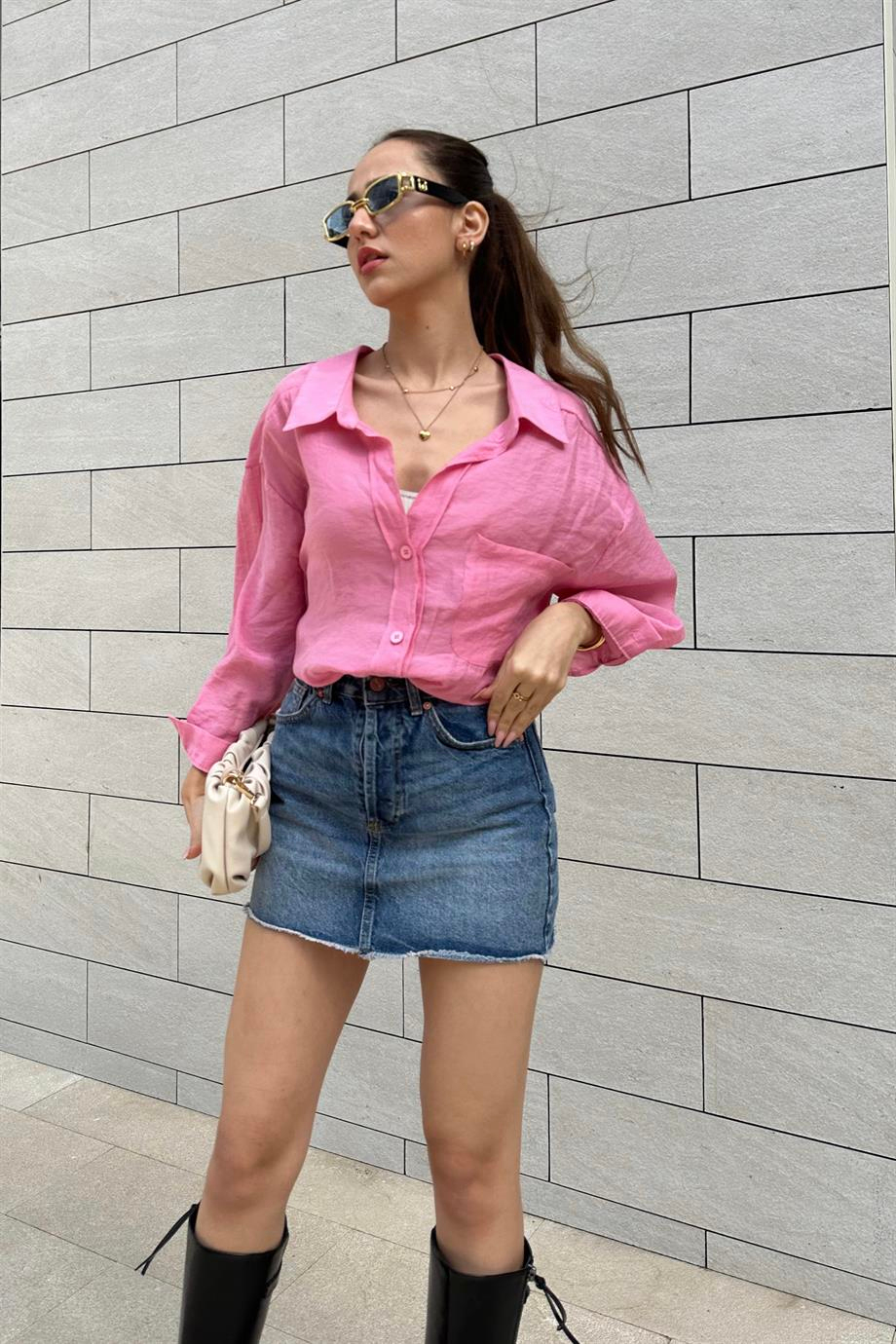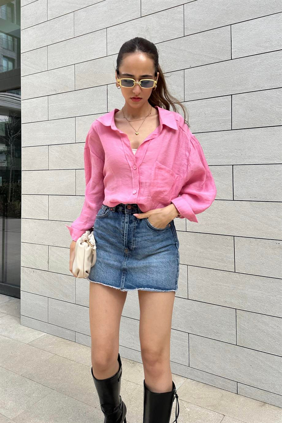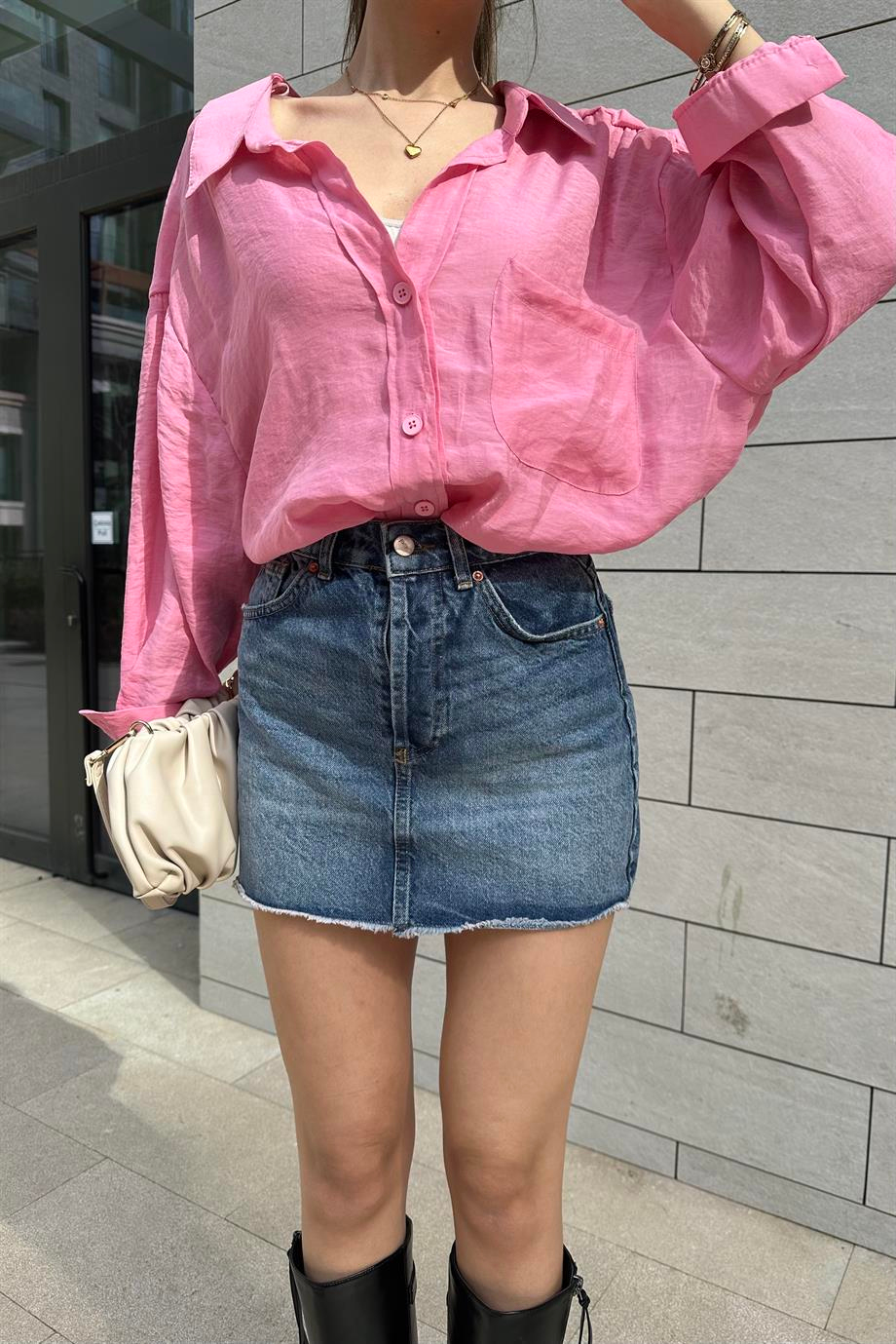 Pink Low Shoulder Oversized Shirt. %70 Cotton %30 Viscose. The image is STD size. Modal Size: Height:172 cm Weight: 52 kg Waist:61 cm Hip:90 cm.