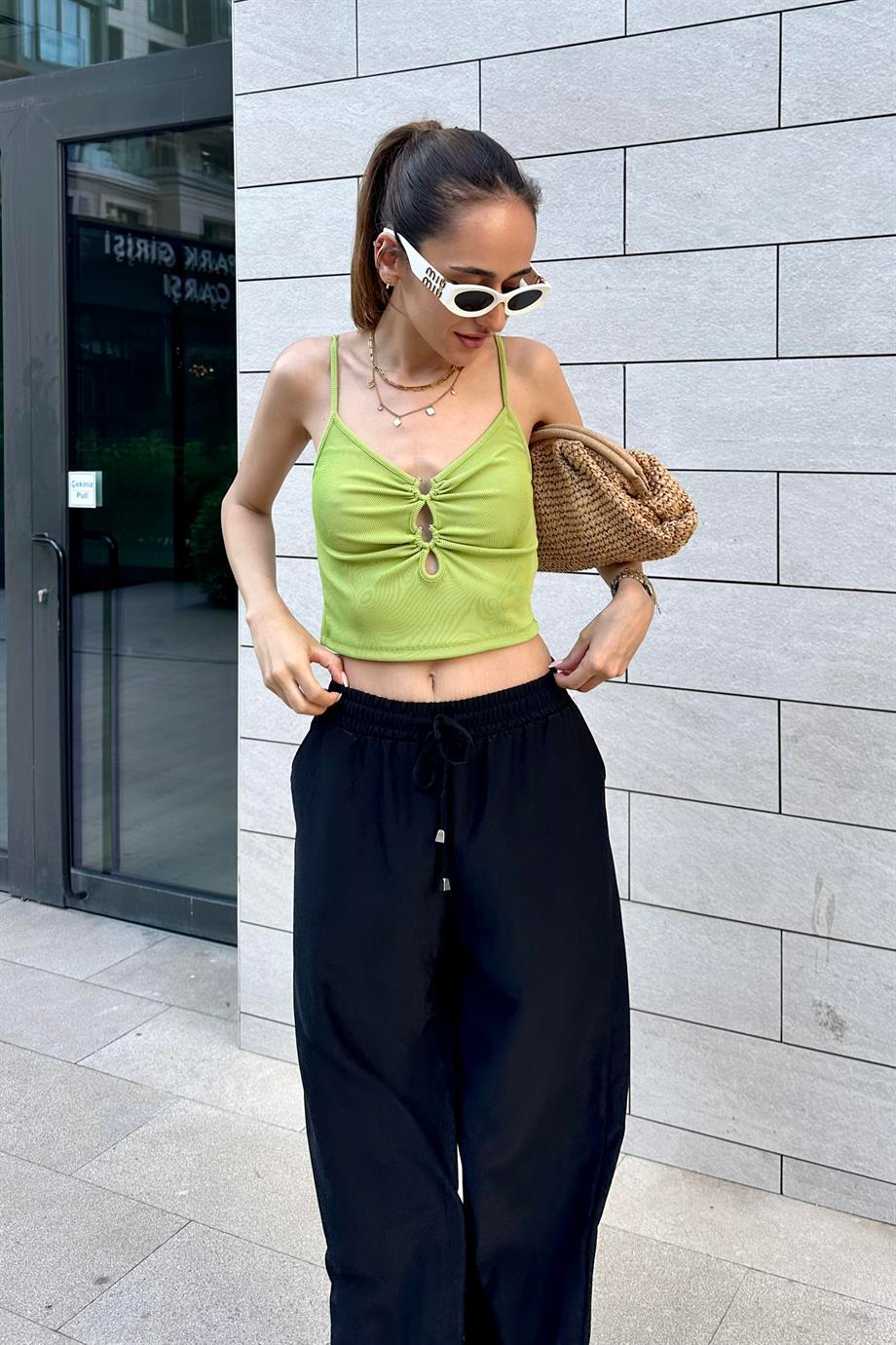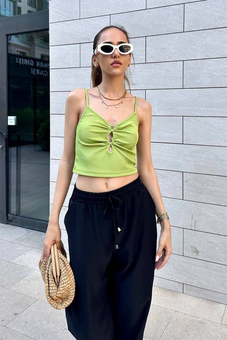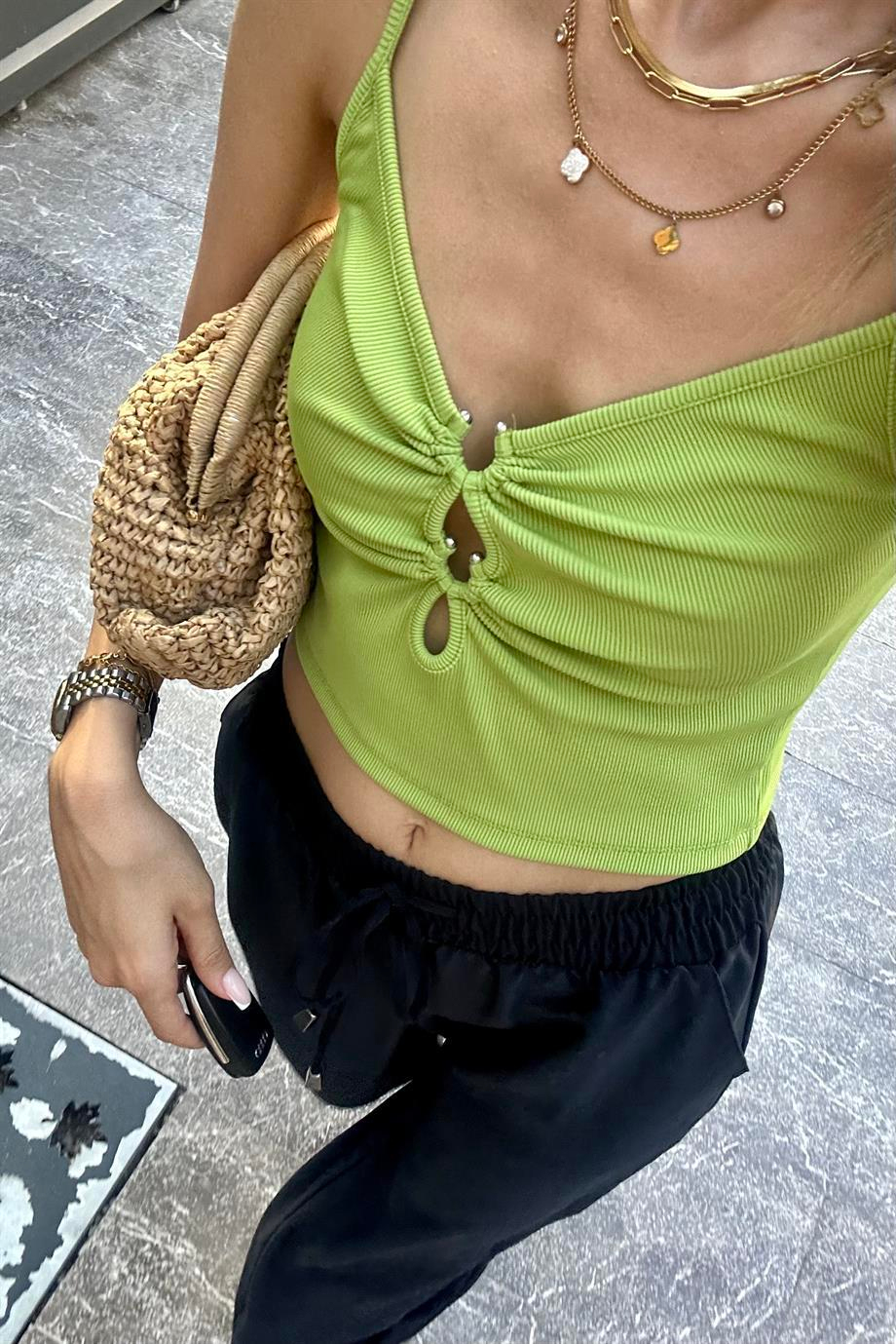 Pistachio Green Strappy Cropped Body. %97 Cotton %3 Elastane.The product is from original brand. The image is XS size. Modal Size: Height:175 cm Weight: 52 kg Waist:62 cm Hip: 92cm.
