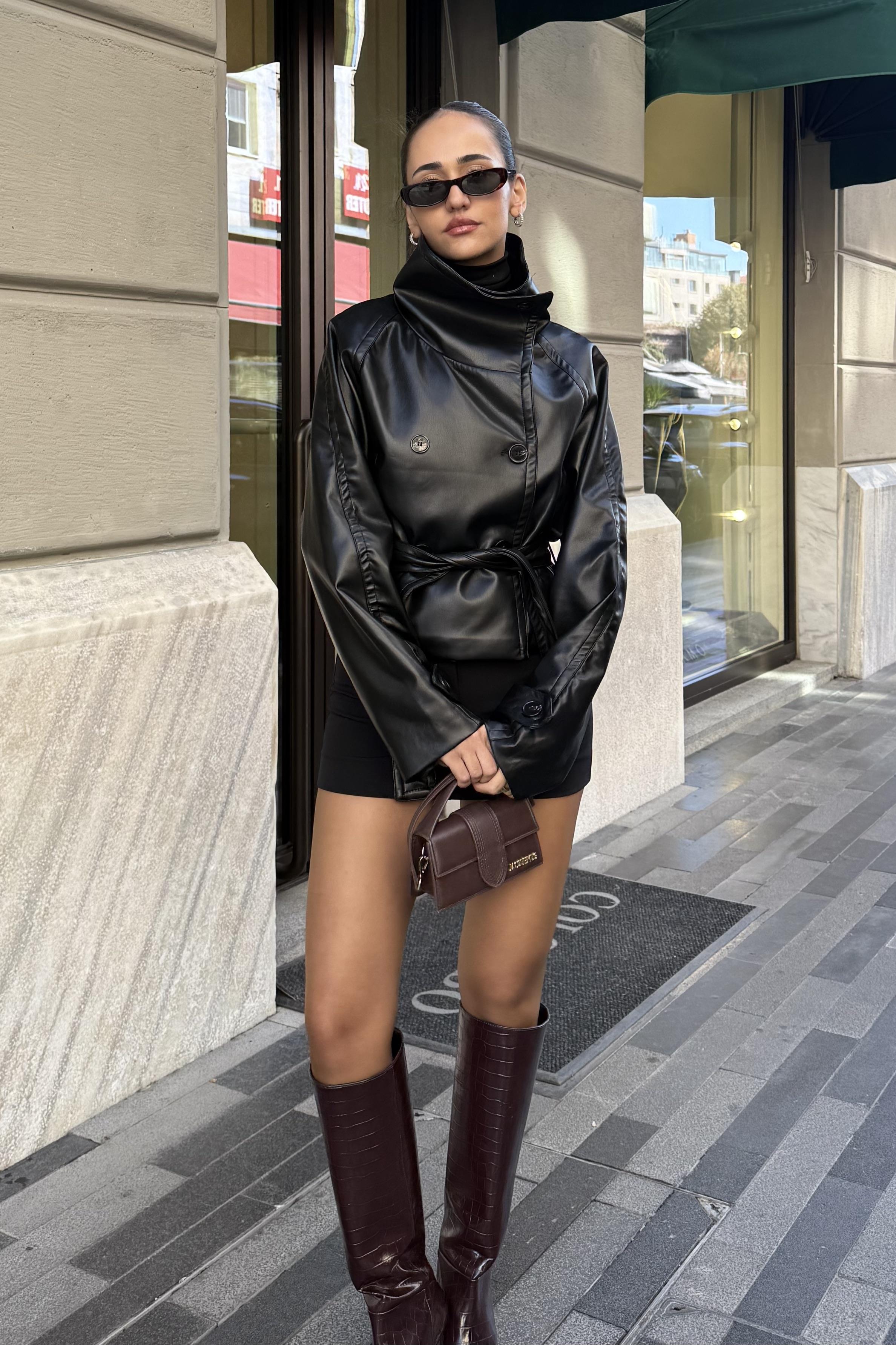 Siyah Dik Yaka Premium Deri Trençkot. %100 Suni deri. Görsel S bendendir. Ürün boyu: 60 cm dir. Model Ölçüleri: Boy:172 cm Kilo: 52 kg Bel:60 cm Basen:90 cm.