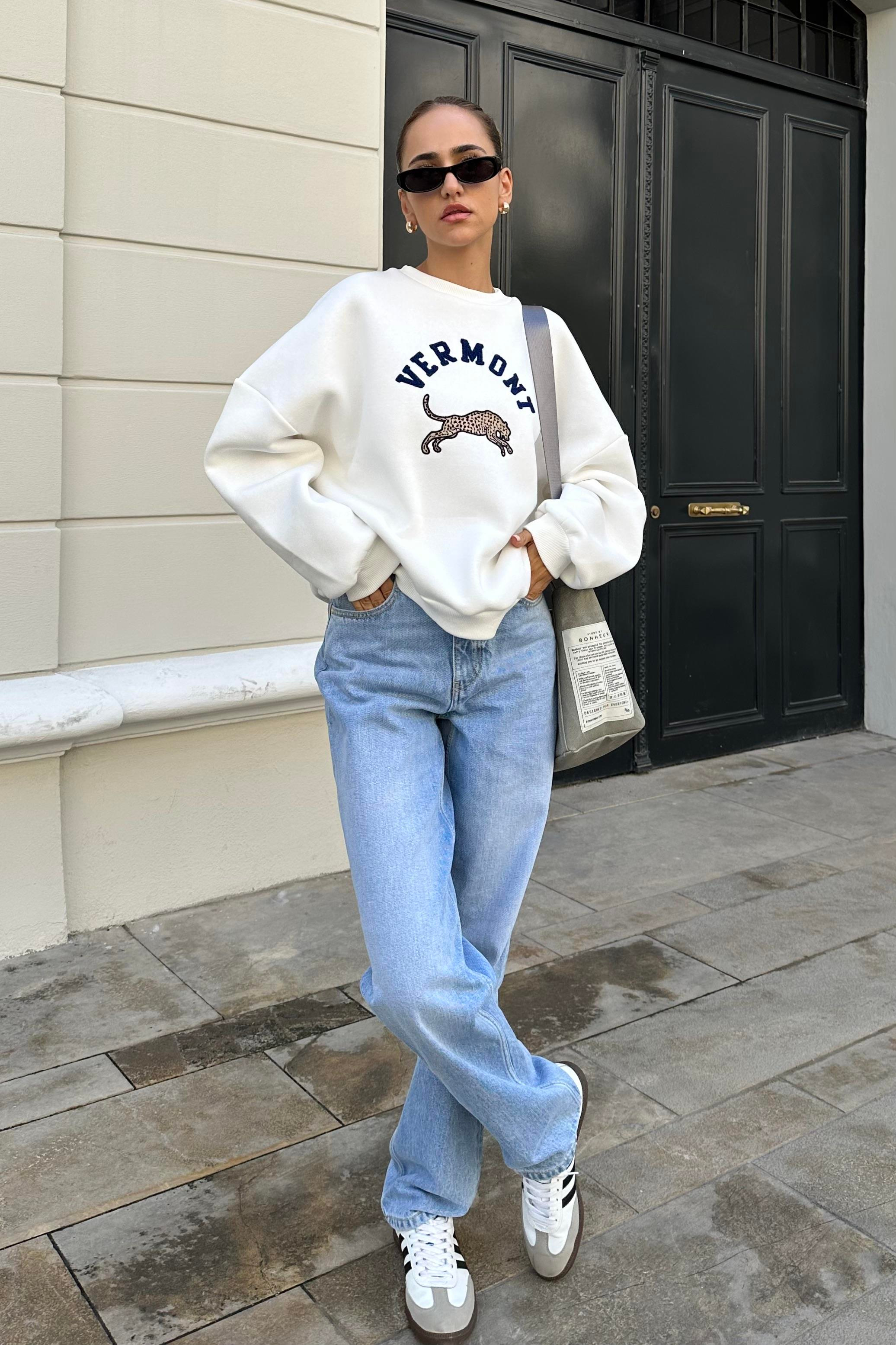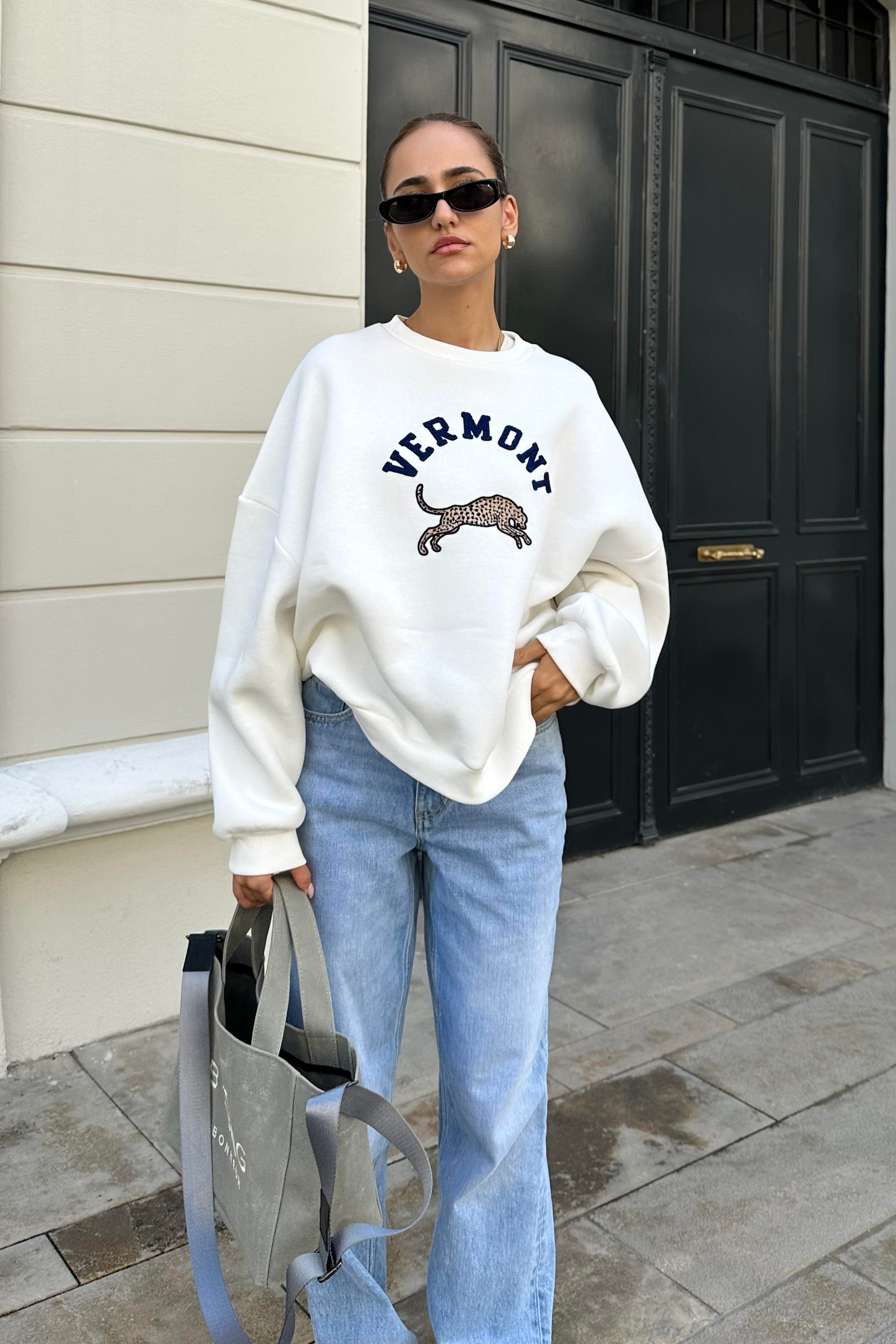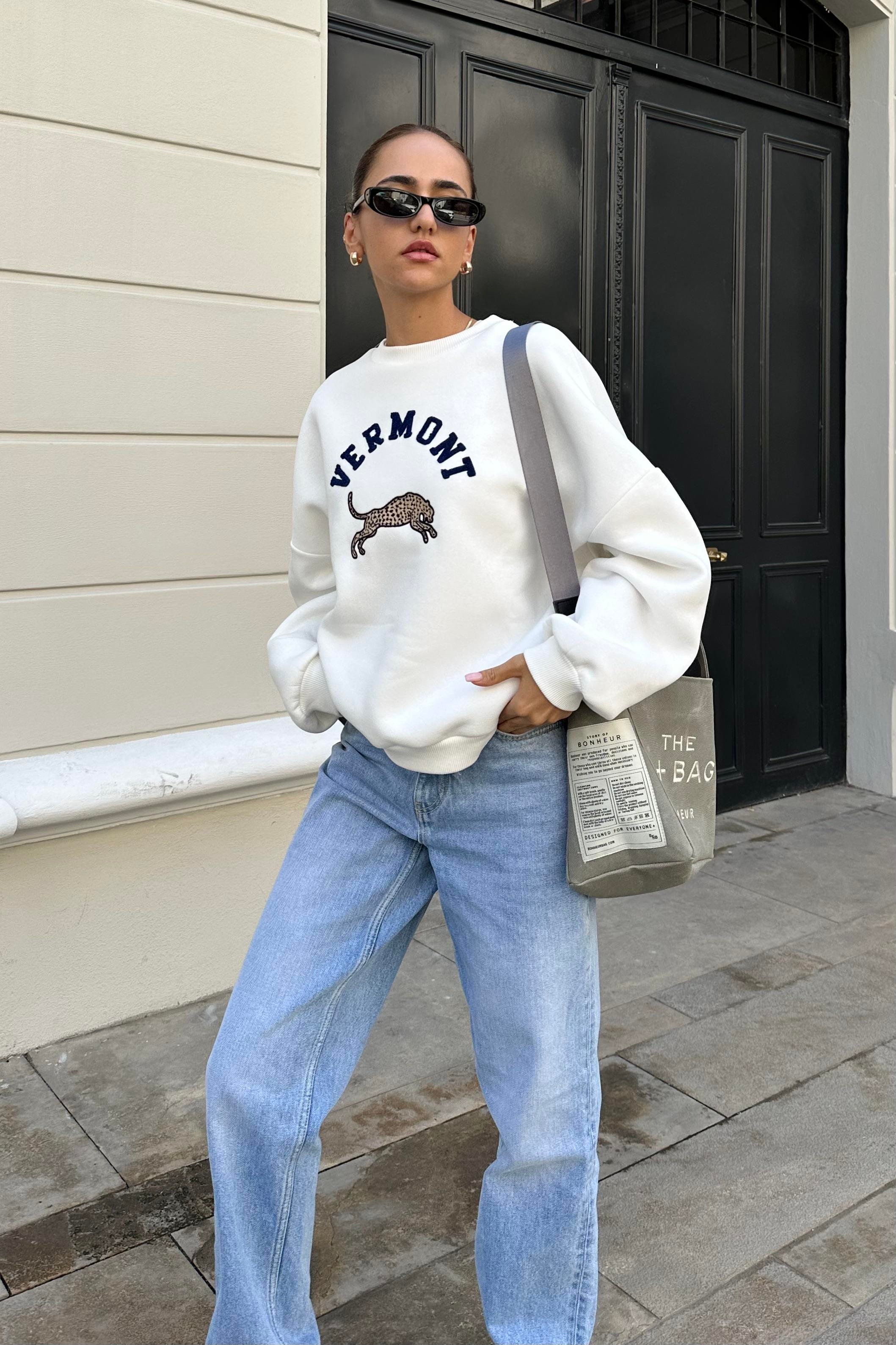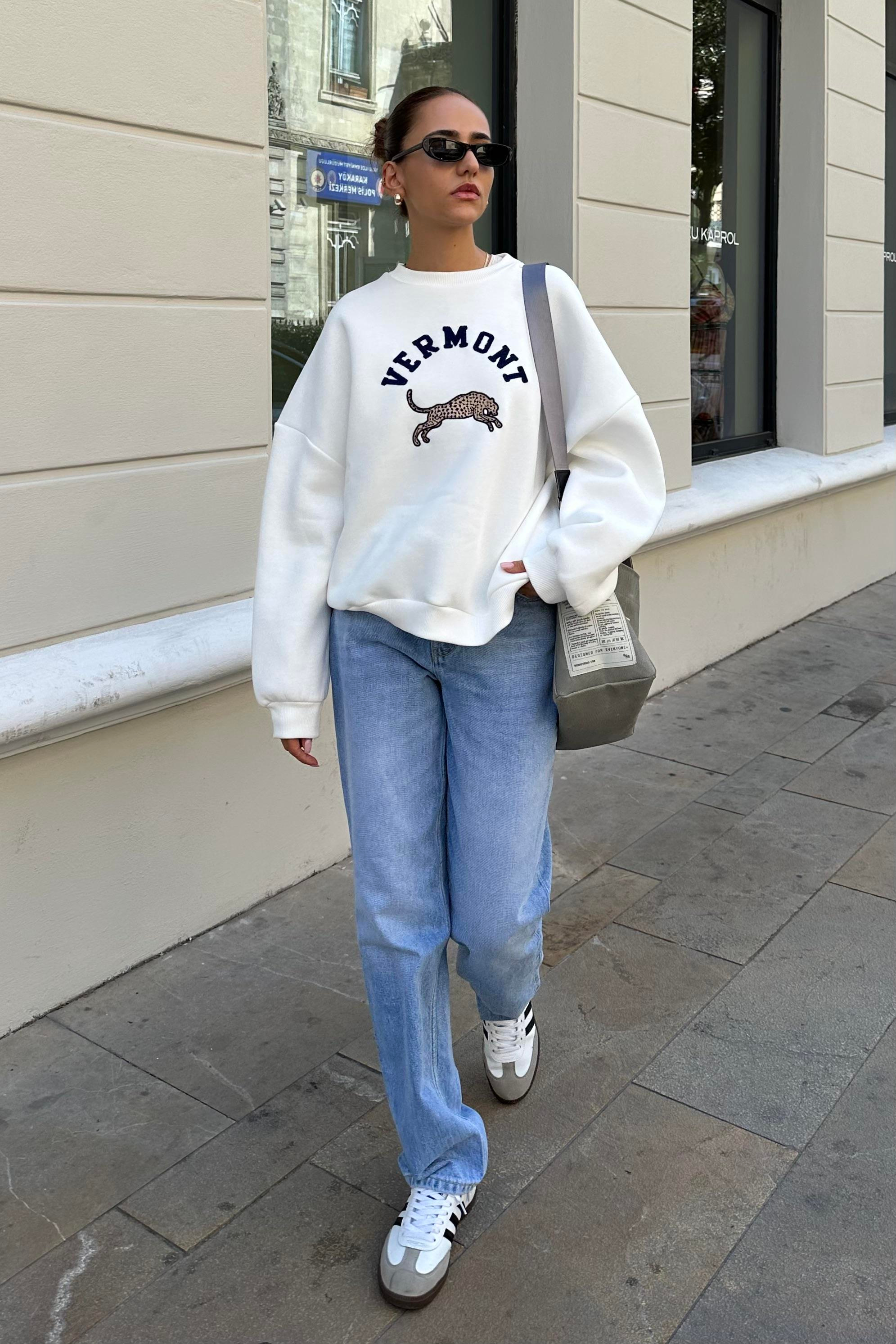 White Brouded Crew Neck Sweatshirt. %100 Cotton.It has broidery and inside is soft polar. The image is S size. Modal Size: Height:172 cm Weight: 52 kg Waist:61 cm Hip:90 cm.