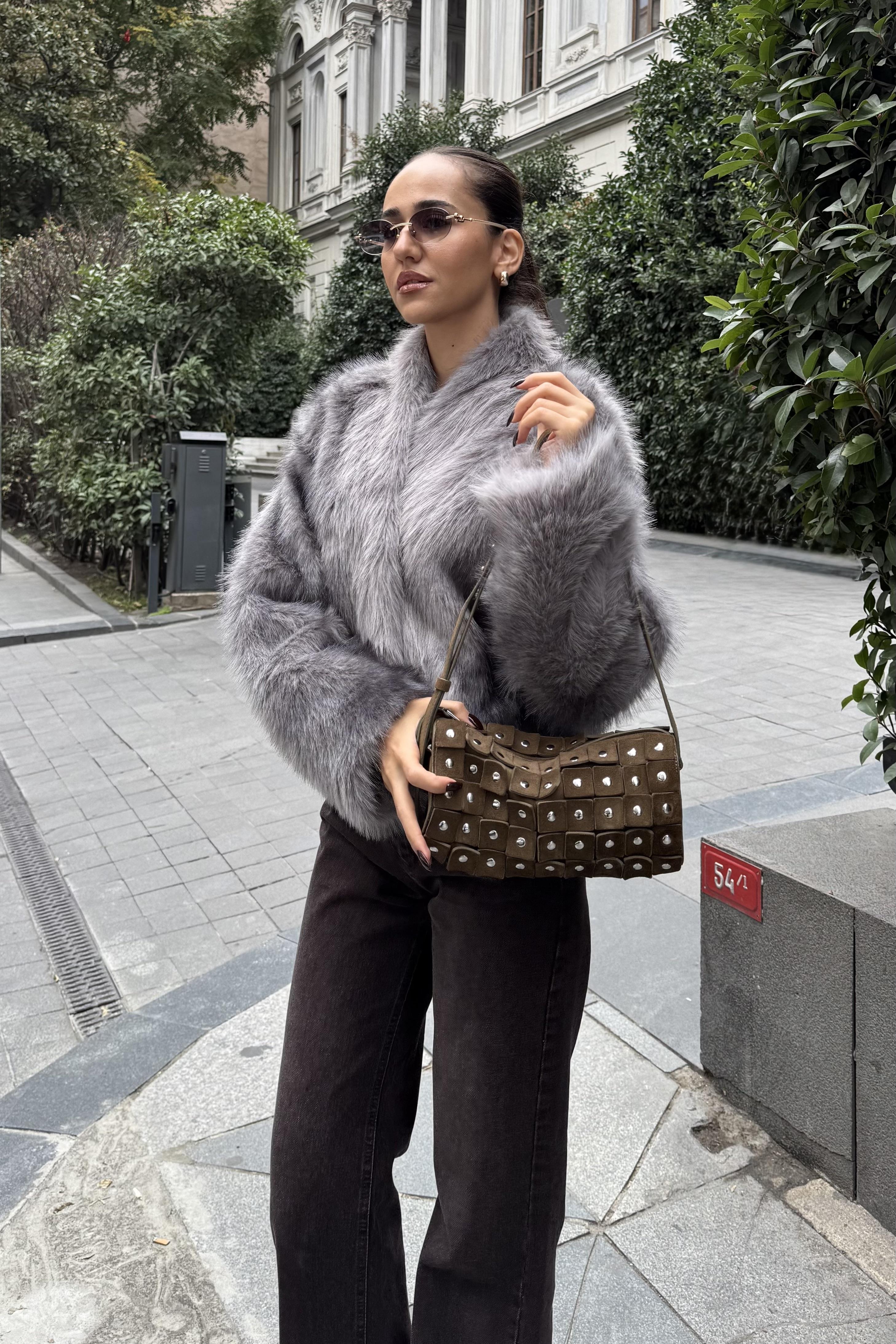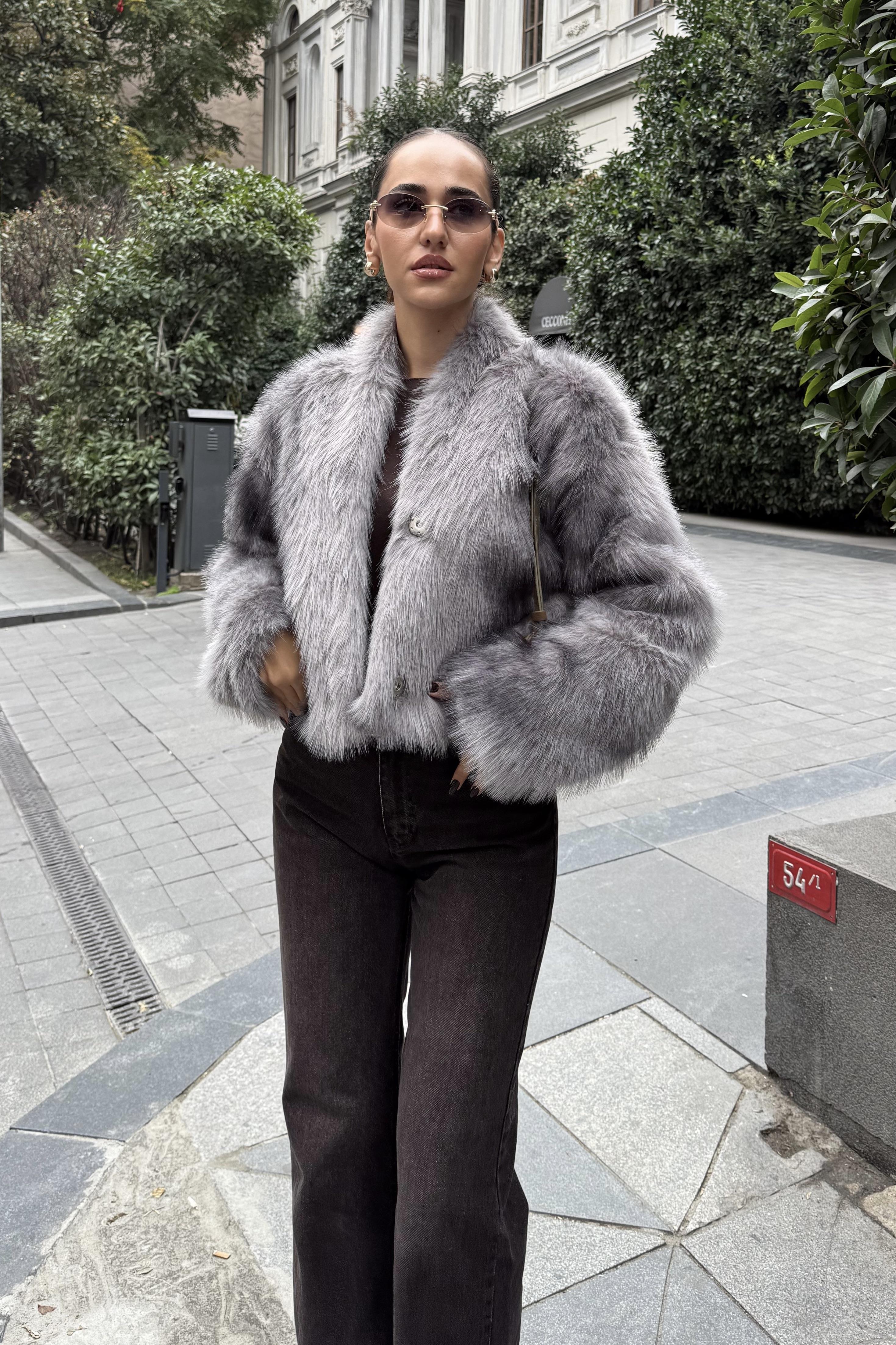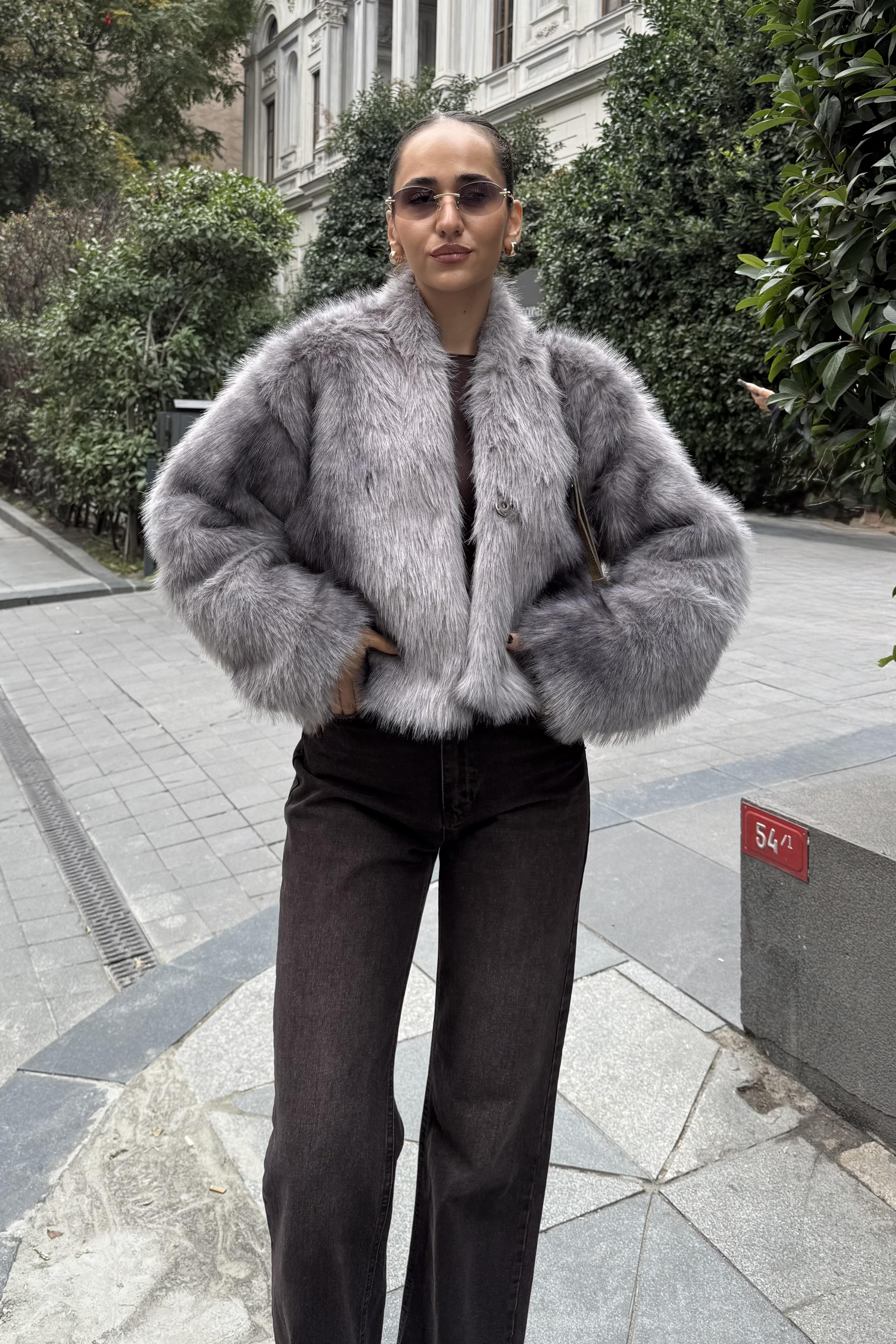Gri Premium Midi Kürk. Görsel S bedendir. Çıtçıt kapama mevcuttur. Model Ölçüleri: Boy:172 cm Kilo: 52 kg Bel: 61 cm Basen: 90 cm.